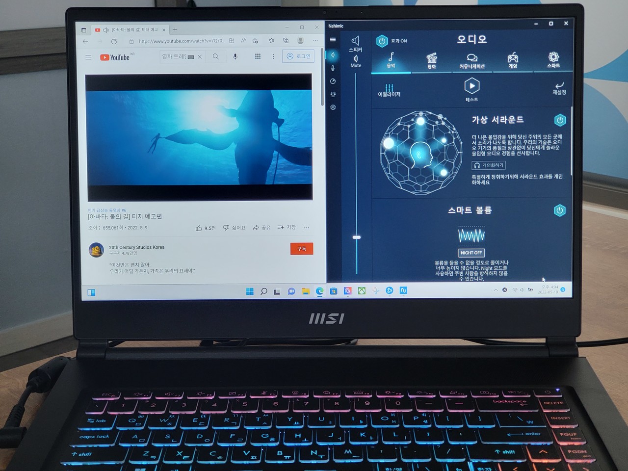 오디오는 Hi-Res 오디오 규격 DAC(192KHz/24bit) 및 나히믹 3 3D 서라운드 오디오 기능을 지원한다. 나히믹 사운드 적용 시 현장감이 강화된다. 적용 후에는 소리가 머리 바로 앞으로 나오는 느낌을 받을 수 있다. 이 장점은 게임 시에도 적용된다.