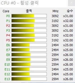 블렌더 벤치마크 구동 시에는 CPU에 풀로드가 걸린다. 이때 CPU 패키지 온도는 최대 96도를 기록한 뒤 평균 88도에서 안정화된다. 올코어 클럭은 P코어 3.1GHz, E코어 2.5GHz로 확인된다.