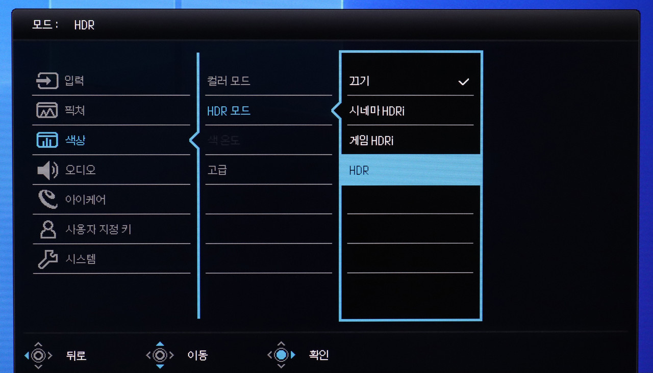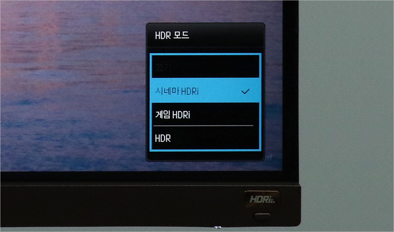 모니터 OSD 상세 메뉴에 들어가면 ‘HDR 모드’가 있는데 거기에서 ‘시네마 HDRi’와 ‘게임 HDRi’ 중 두 가지를 선택할 수 있다. ‘HDR’은 앞서 살펴본 HDR 모드이고 PC에서 HDR 기능을 켠 경우 자동으로 적용된다.