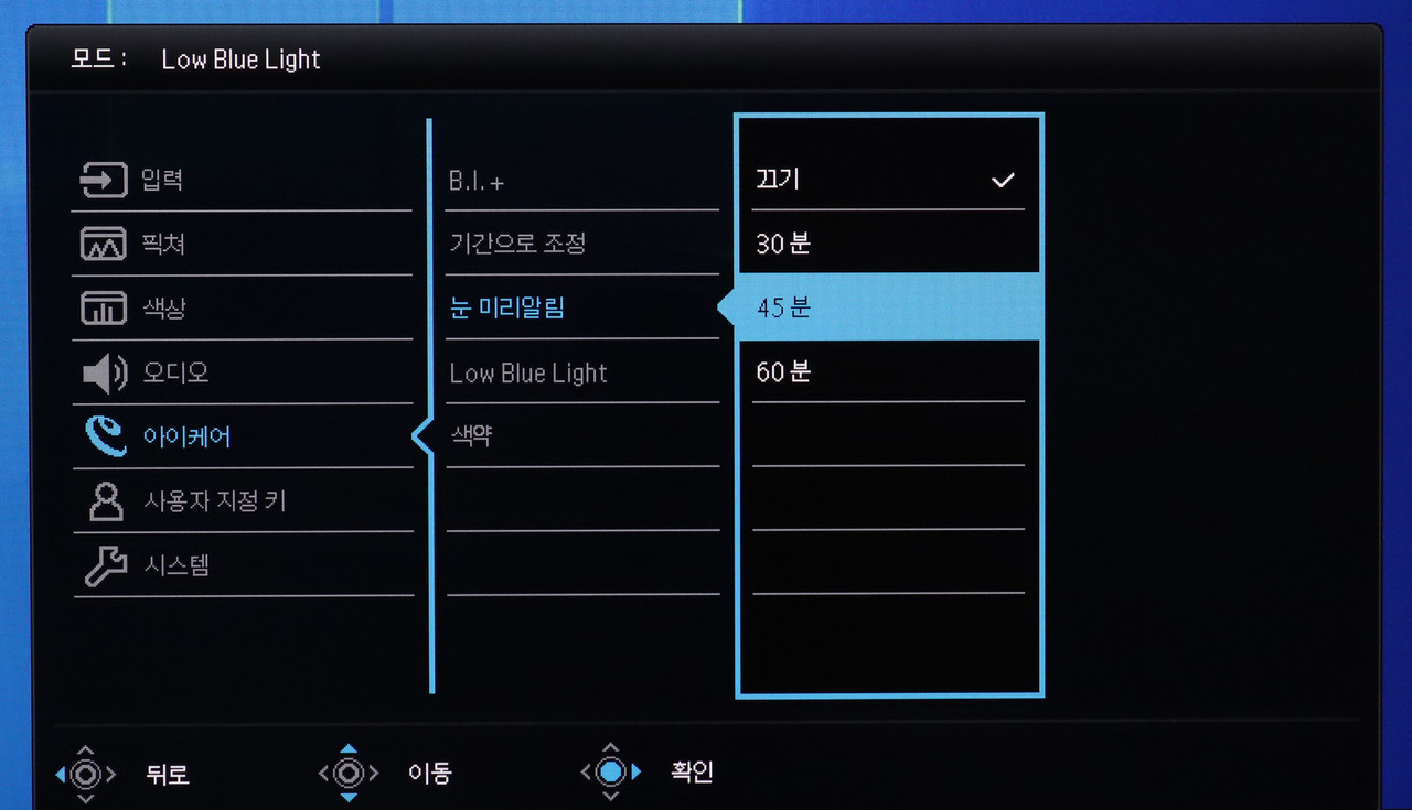 아이케어 모드 가운데 가장 눈여겨봐야 하는 것은 B.I.+이다. 모니터 패널 중앙 하단에 장착된 센서를 통해 주변 광량을 감지하고 자동으로 화면 밝기를 조절하는 것이 특징이다.