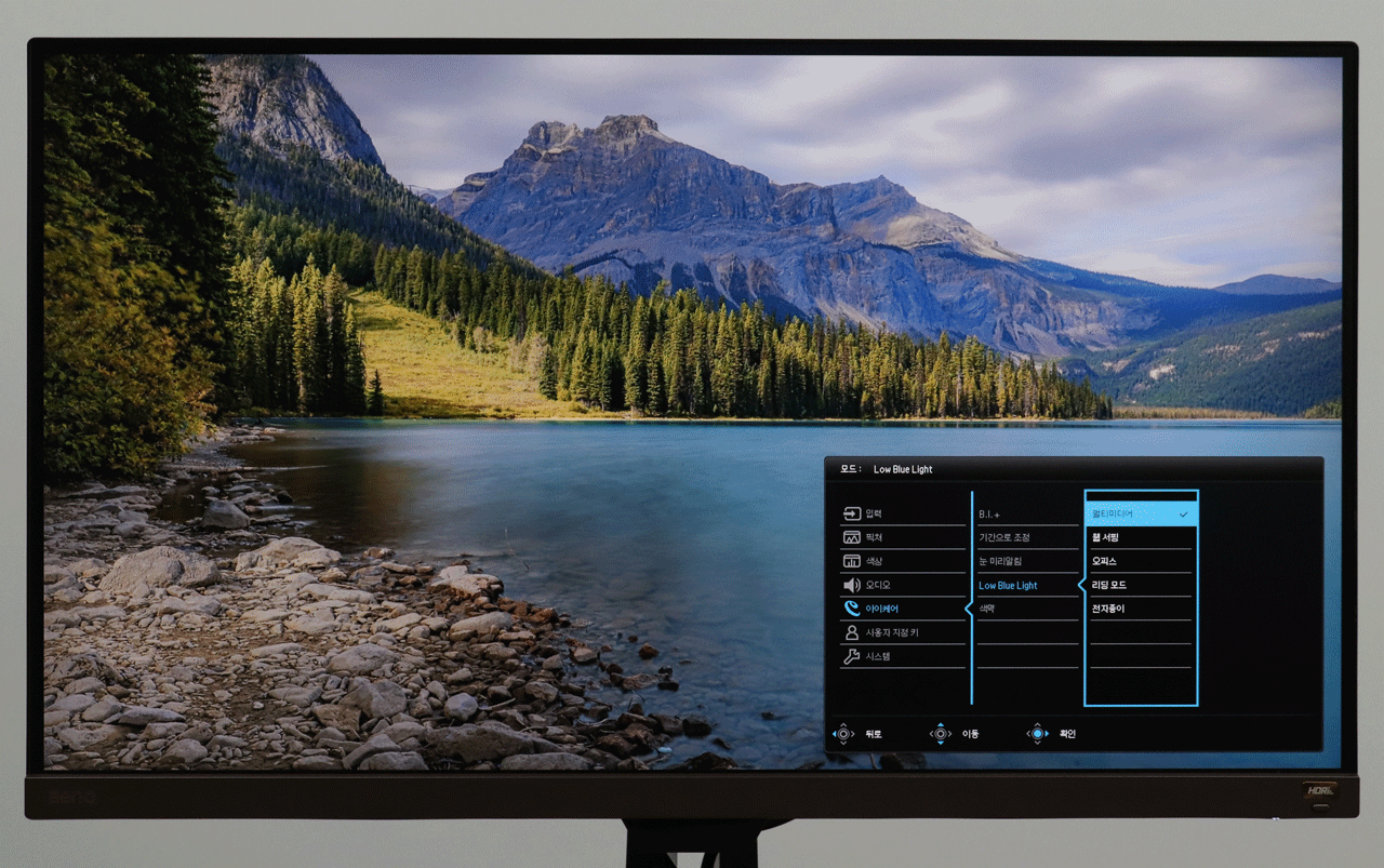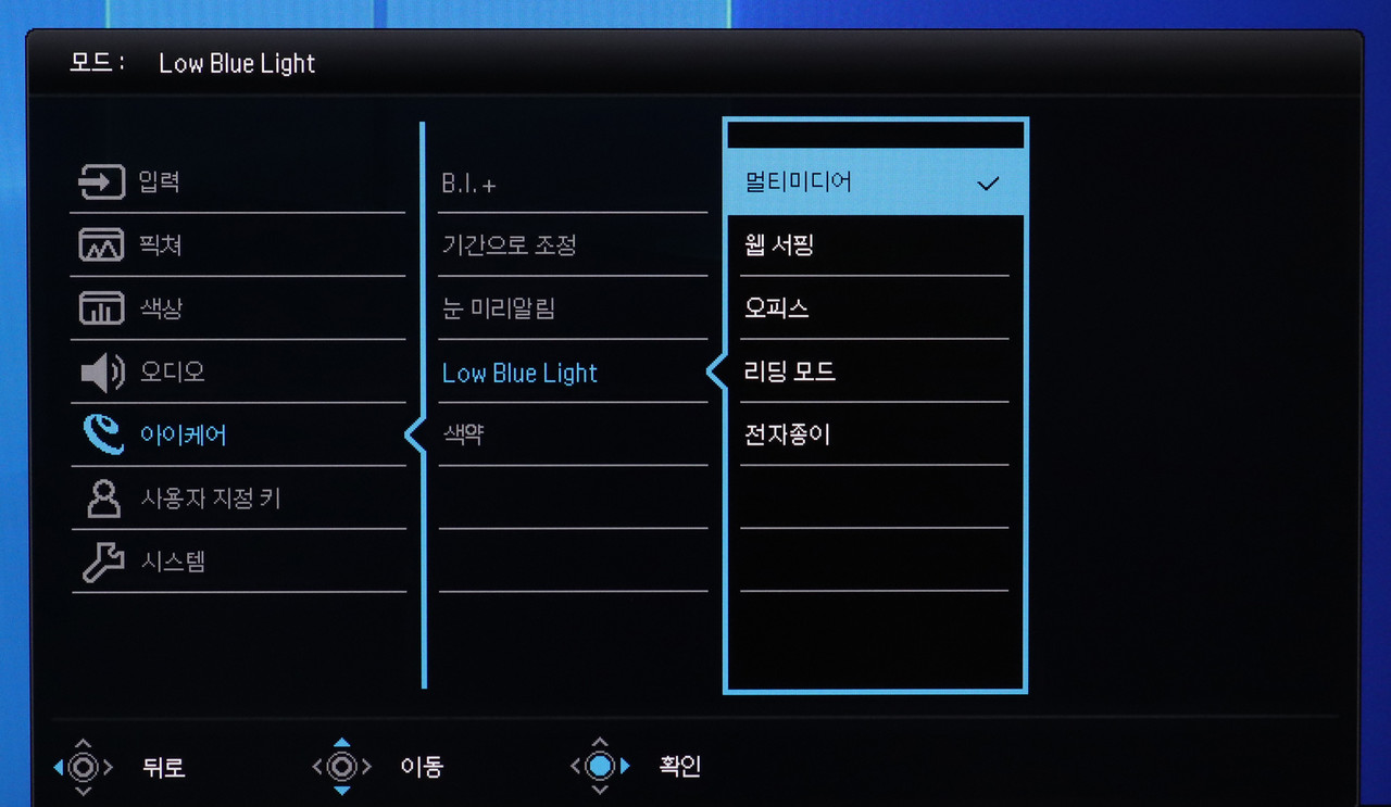그 다음으로 유용한 것은 로우 블루 라이트이다. 총 다섯 단계로 청색광을 조절할 수 있는데 ‘멀티미디어’ 모드에서 차단되는 청색광이 가장 적고 ‘전자종이’ 모드에서 가장 많은 청색광이 차단된다.