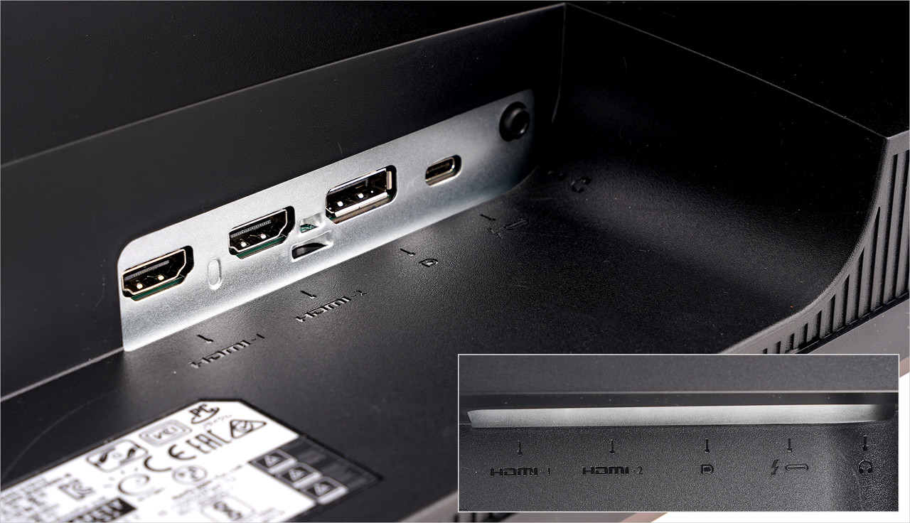 벤큐 EW2880U와 다른 기기를 연결하는 인터페이스로는 HDMI 2.0 포트 2개와 DP(DisplayPort) 1.4 1개, USB-C 포트 1개, 3.5mm 오디오 출력 포트가 있다.