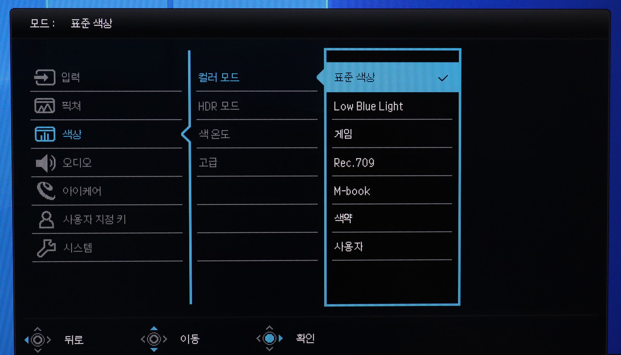 이 제품은 상황 별로 유용하게 사용 가능한 컬러 모드를 일곱 가지 제공한다. OSD 상세 메뉴에 들어가면 ‘색상’ 항목 아래에서 찾을 수 있다.