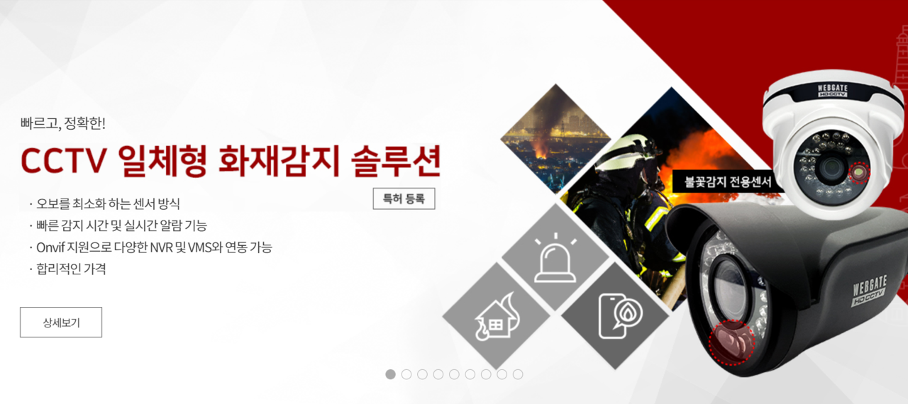 통합 영상보안 솔루션 전문기업 웹게이트의 네트워크 AI 카메라에도 주목할 만하다. 해당 카메라는 국산 SoC가 탑재돼 빠르게 파악할 수 있다. 대표 제품이 CCTV 일체형 불꽃감지 카메라다. 불꽃 고유의 파장을 센서로 감지한 후 AI로 분석한다. 이후 관제실 인원에게 경보 알림이 가 빠른 초기진화가 가능하다.