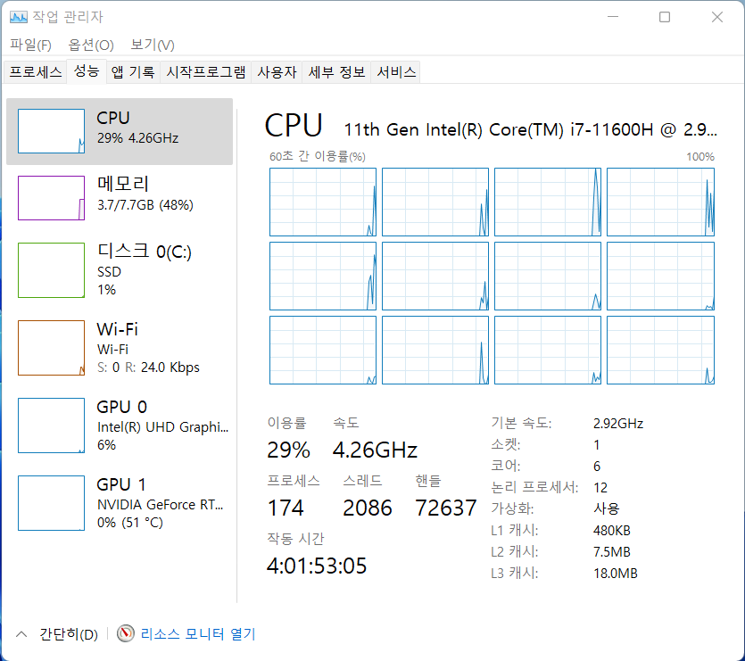 CPU : 인텔 코어 i7-11600H(2.9GHz up to 4.3GHz, 18MB L3 캐시)