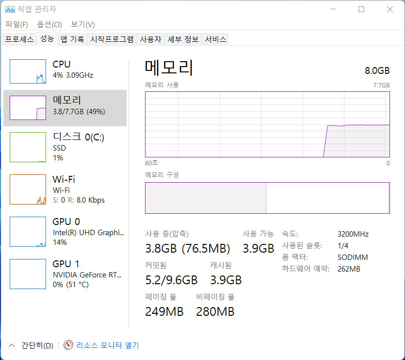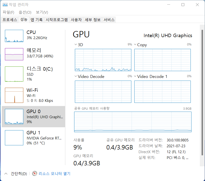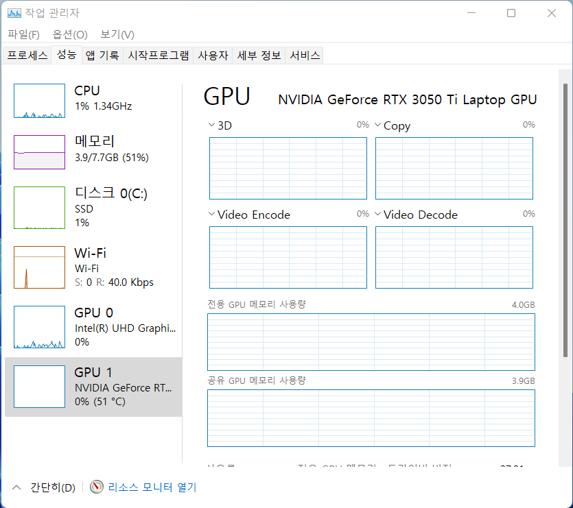 그래픽 : 엔비디아 지포스 RTX 3050 Ti Max-Q Graphics with GDDR6 4GB 그래픽 메모리