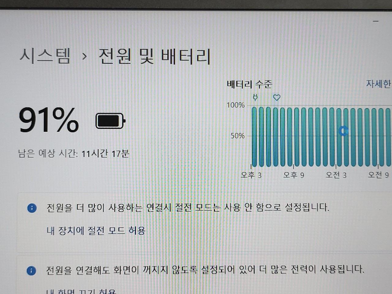 배터리는 83Whr 배터리가 장착됐다. 배터리 93%에서 배터리 절약 모드로 설정한 뒤 밝기 50% 상태로 대략 11시간 17분을 사용할 수 있었다. 어댑터 용량은 135W다. PD 충전 기능도 지원되는 것을 확인할 수 있었다.