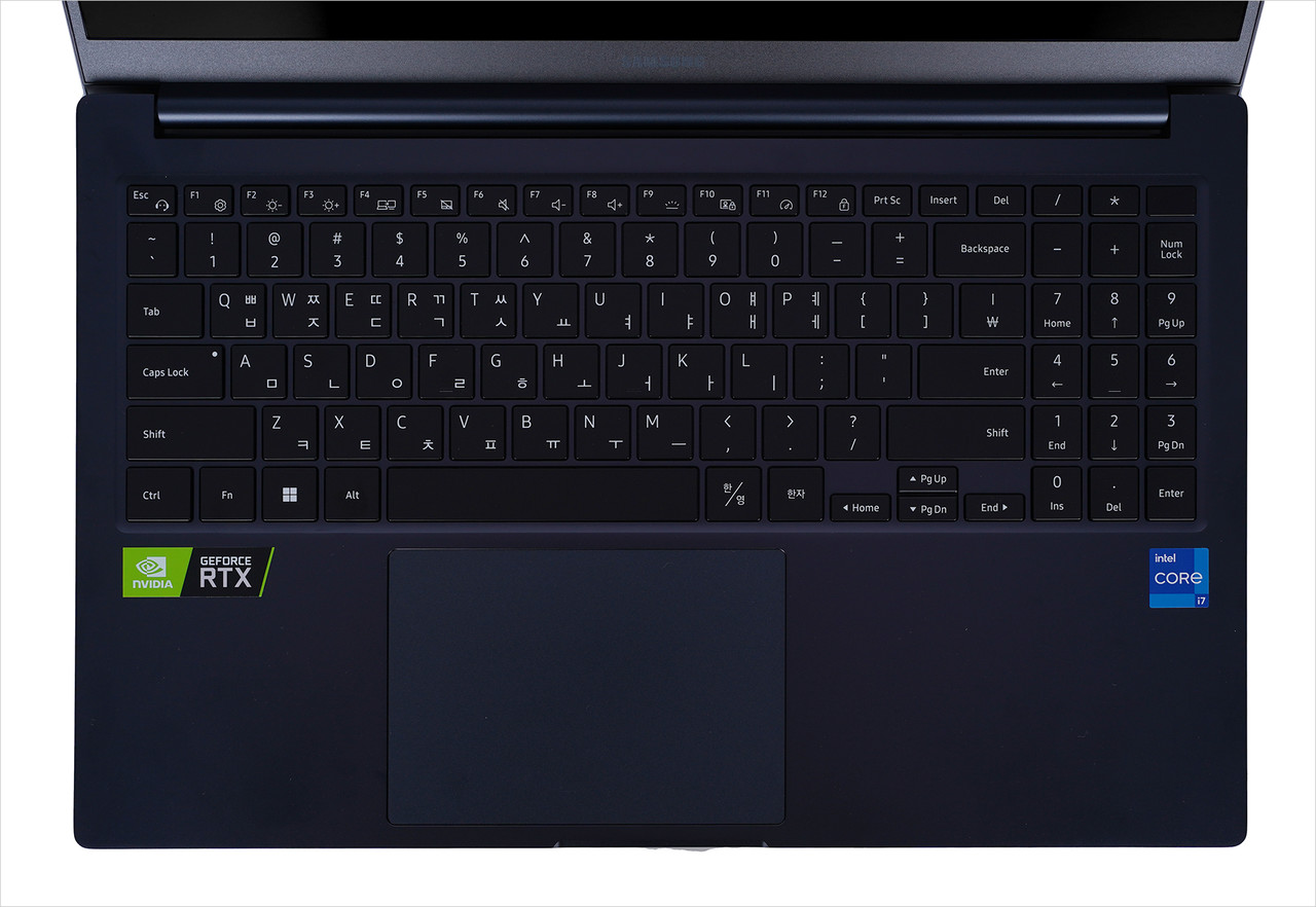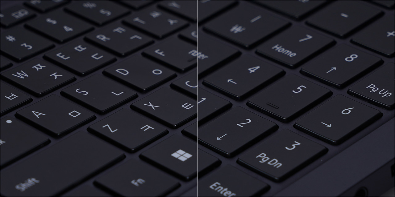 키보드는 풀배열로 우측 숫자키를 갖춰 생산성 작업에 적합하다. 우측 시프트 크기는 삼성 노트북답게 정상 사이즈다. 방향키가 작은 정도인데, 사실 방향키가 작아도 딱히 불편할 일은 없다. 타건감은 부드럽고 키 간 사이가 적당해 오타가 덜 난다. 또한 화이트 LED 백라이트가 적용됐다. 어두운 곳에서도 키 위치를 쉽게 찾을 수 있다.
