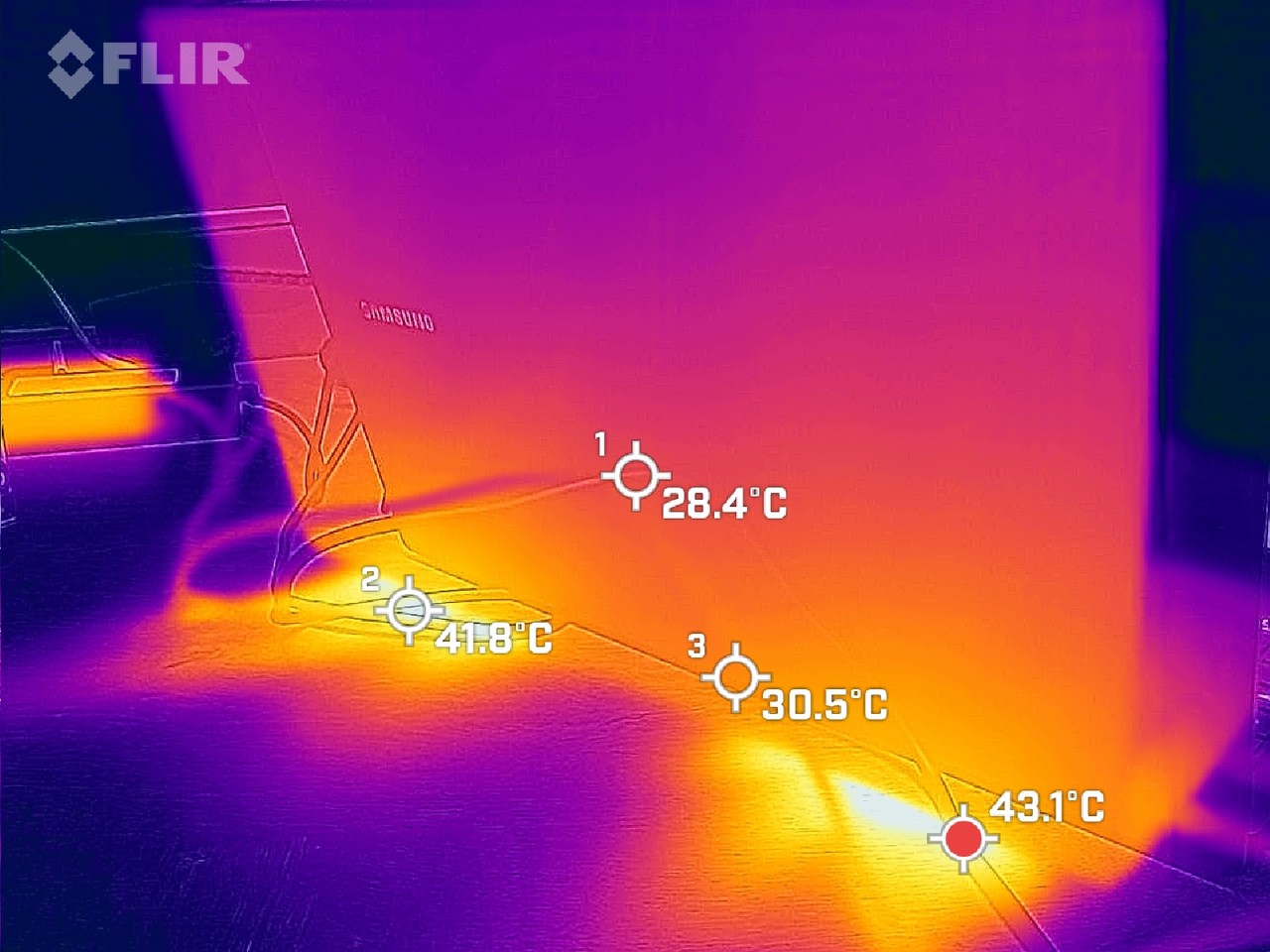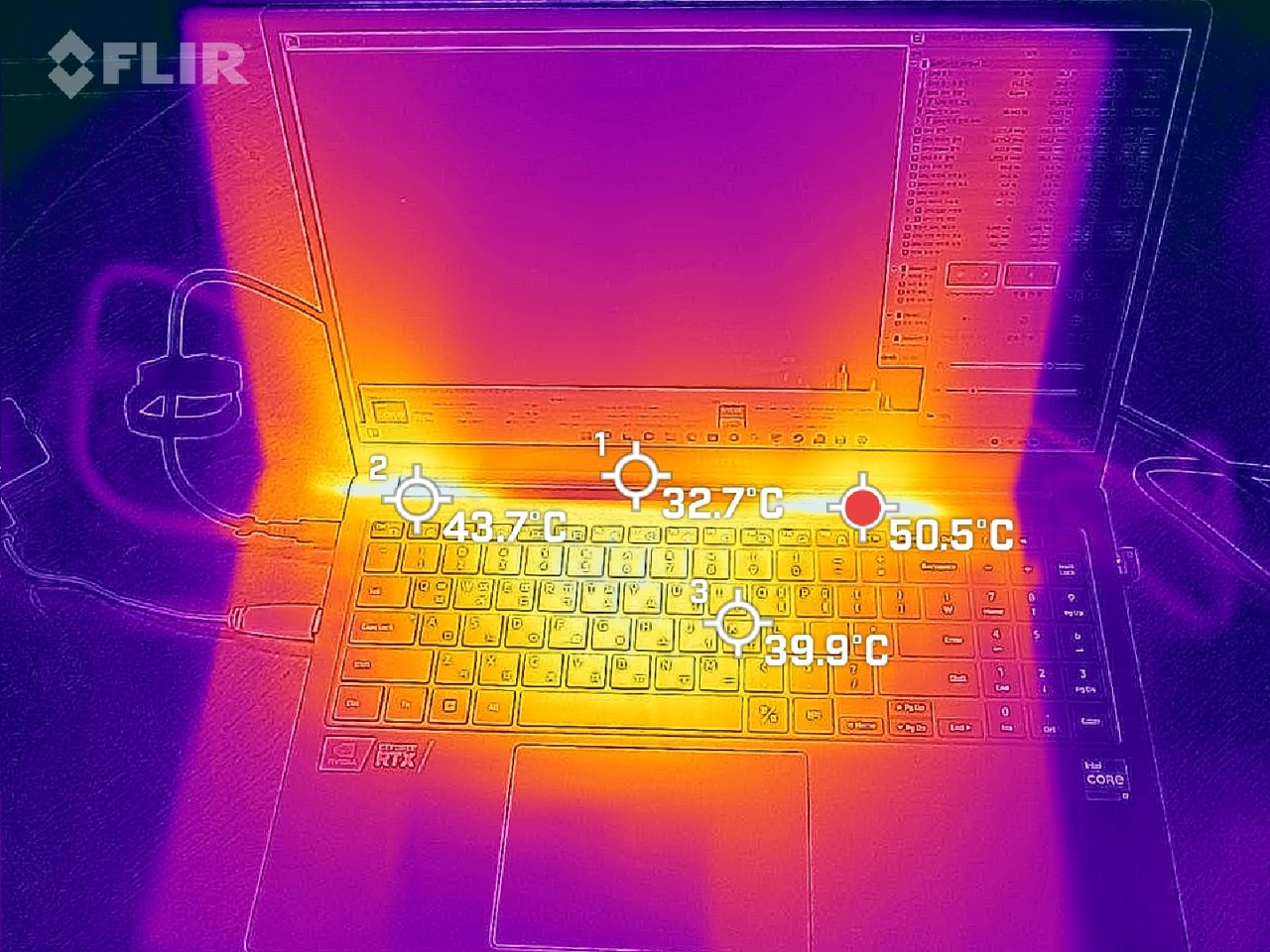 키보드 중앙부는 39.9도, 상단부는 50.5도로 확인된다. 노트북 후면은 43.1도로 측정됐다.