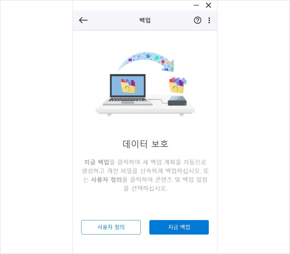 툴킷 기본 화면에서 ‘백업’을 선택하면 ‘데이터 보호’ 항목이 나타나는데 하단에 보이는 ‘사용자 정의’와 ‘지금 백업’을 이용해서 백업을 할 수 있다. 지금 백업은 간단하게 패스트 익스팬션 SSD로 사용자 PC 데이터를 백업하지만 모든 파일을 전송하기 때문에 시간이 오래 걸린다. 사용자 정의 항목을 이용해서 원하는 파일만 백업하는 것이 효율적이다.