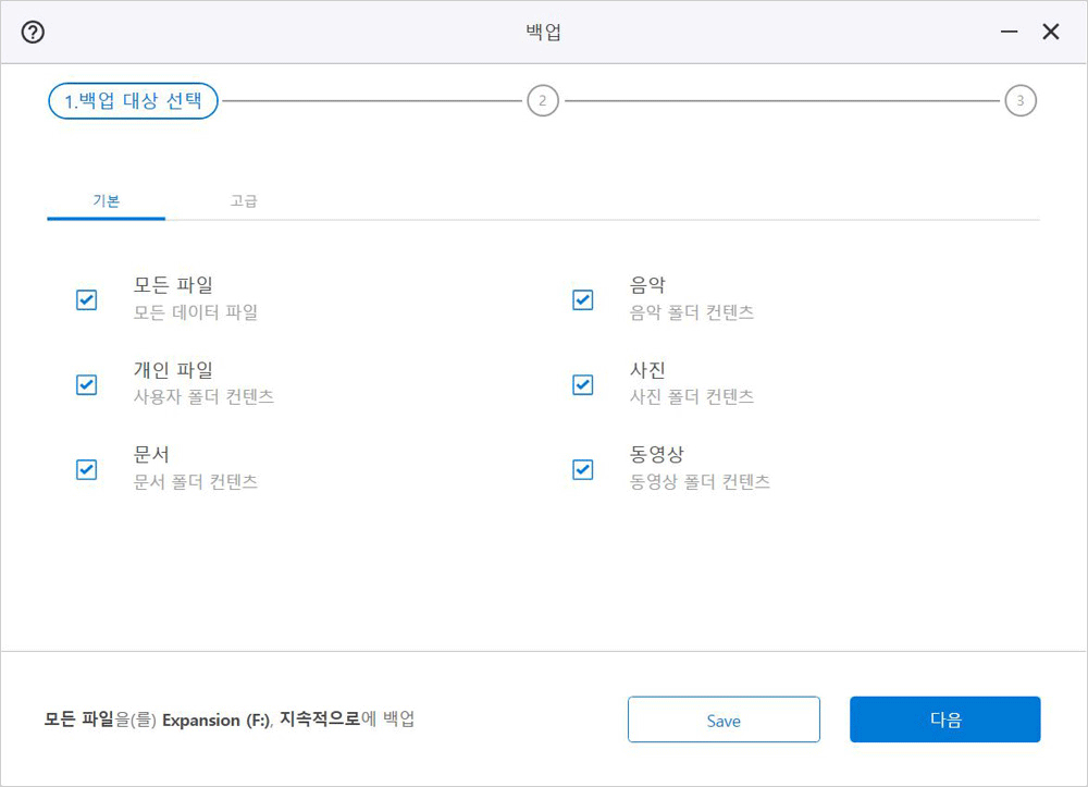 ‘백업 대상 선택’ 화면이 나오면 ‘기본’ 탭에서 여섯 가지 종류로 파일을 분류해 백업하거나, ‘고급’ 탭에서 폴더를 지정하여 백업할 수 있다. 폴더를 지정하는 쪽이 어떤 파일을 백업했는지 기억하기 쉽고 불필요한 백업을 최소화시킨다.