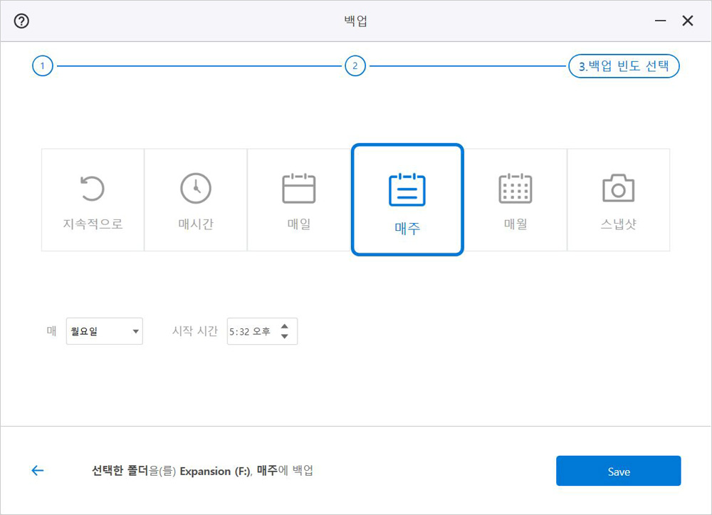 ‘백업 빈도 선택’에서는 사용자가 원하는 백업 일정을 고를 수 있다. ‘지속적으로’를 선택하면 백업 대상으로 지정한 PC 폴더에 파일이 추가되는 경우 툴킷이 감지하여 패스트 익스팬션 SSD에 자동 백업한다. ‘스냅샷’은 지금 즉시 백업하고 싶을 때 이용하는 것이고, 나머지 네 가지는 그 명칭대로 사용자가 원하는 시간에 주기적으로 백업한다.