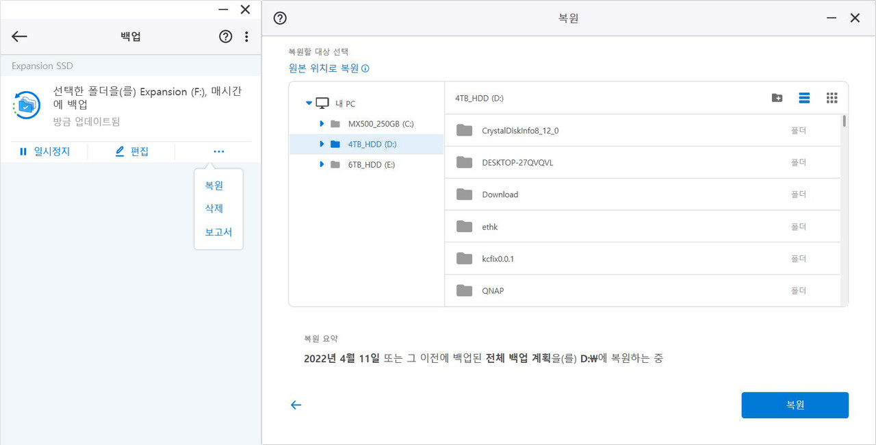 백업한 파일 · 폴더 일부만 복원하는 것도 가능하고 백업을 여러 번 했다면 일자 및 시간 별로 버전이 따로 표시되어서 구분하기 쉽다.