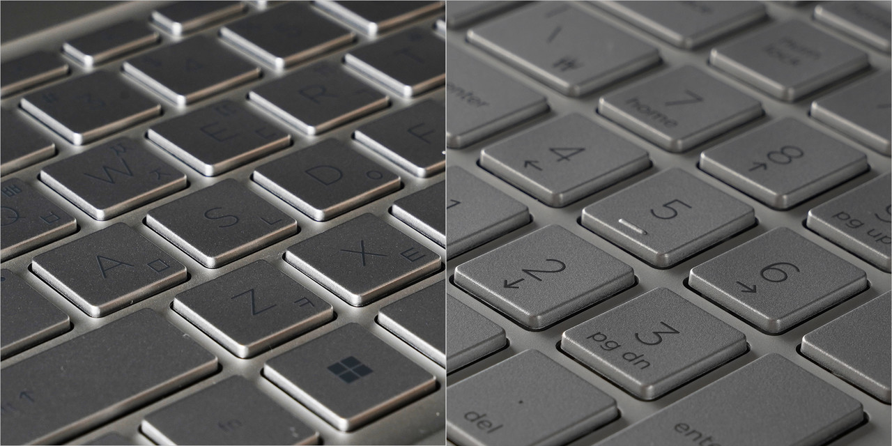 키보드는 익숙한 배열이다. 특히 방향키가 작은 대신 우측 시프트가 아주 길다. 타이핑 시 우측 시프트를 주력으로 사용한다면 아주 편하다. 거기에 숫자키도 지원해 생산성 작업에도 적합하다. 타건 시에는 키가 눌리는 깊이가 낮은 편인데, 구분감은 확실하다. 고속 타건에 적합하다. 추가로 지문 인식 기능도 사용할 수 있다