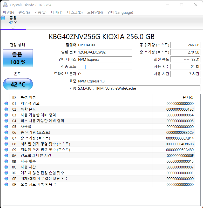 저장장치 : 256GB NVMe M.2 SSD