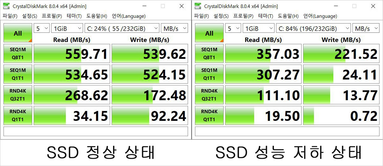 SSD의 이상 징후 중 한 가지는 데이터 읽기 · 쓰기 속도가 평소보다 느려지는 것이다. 분명히 HDD보다 몇 배 이상 빠르게 파일을 전송할 수 있었는데 어느 날 갑자기 속도가 몇 분의 일로 감소해 버렸다면 SSD의 최후가 부쩍 가까워졌다고 의심할 수 있다.