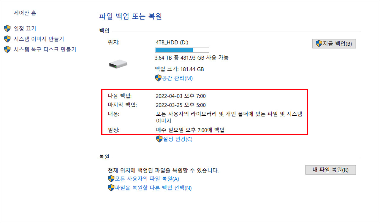 대다수 PC 운영체제는 기본적으로 백업 기능을 제공한다. 윈도우10 기준으로 제어판에서 ‘백업 및 복원’ 항목으로 들어가면 ‘지금 백업’을 클릭해 간단하게 백업을 진행할 수 있다. 물론 백업 전 PC에 다른 스토리지를 연결해야 한다.