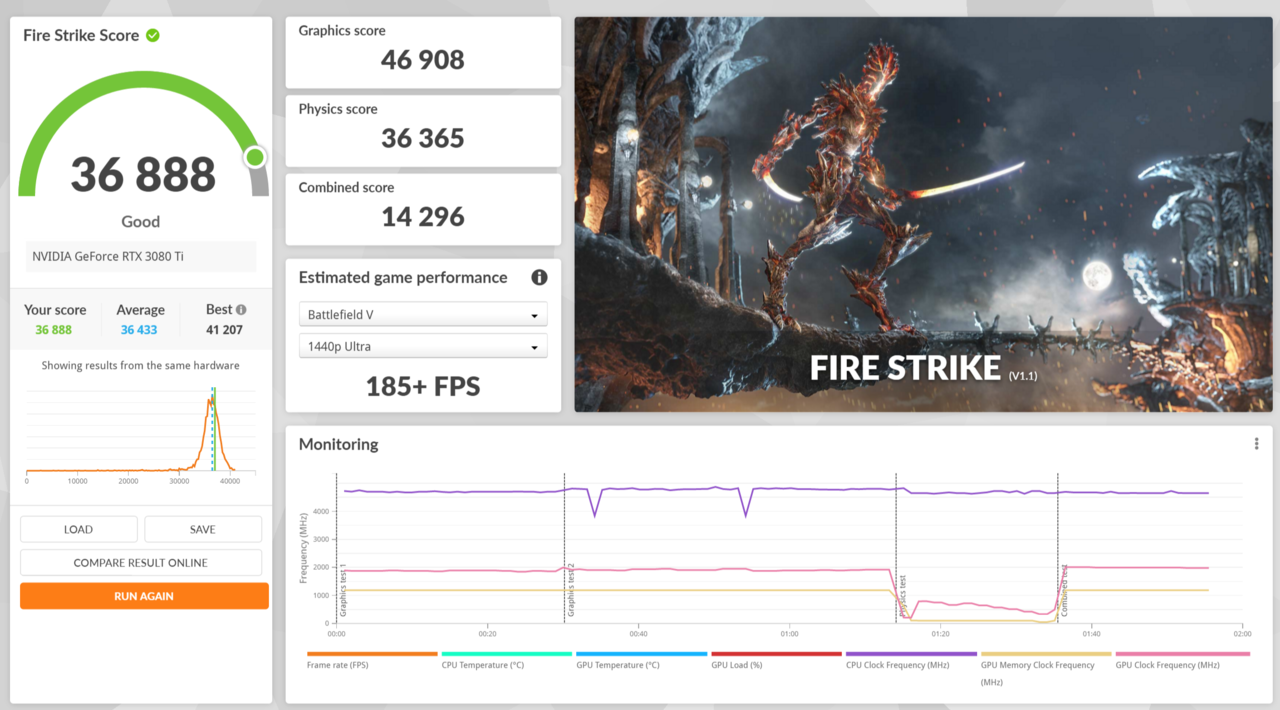 내장된 벤치마크로 평균 프레임을 측정했다.