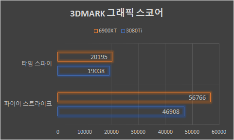 이어 두 그래픽카드의 성능을 비교해 봤다. RX 6900 XT의 테스트는 ASUS TUF Gaming 라데온 RX 6900 XT O16G OC D6 16GB으로 진행했다. 부스트 클럭 2310MHz(게이밍 모드)에 쿨링 성능이 뛰어난 그래픽카드다. RTX 3080 Ti는 부스트클럭 1695MHz에 쿨링 성능이 뛰어난 제품으로 진행했다.