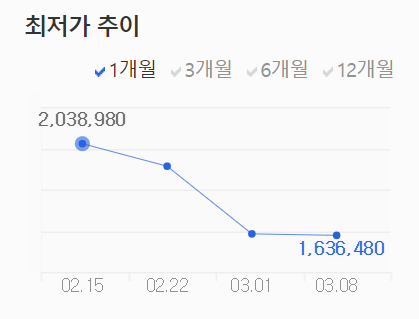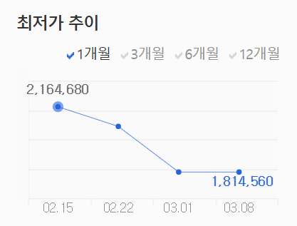 두 카드 다 화끈하게 가격을 내린 것을 확인할 수 있었다. 그렇다면 두 카드 간의 가격 차이는 어떨까? 3월 8일 기준으로 178,080원이다. 그래픽카드 가격이 워낙 비쌌기에 차이가 크지 않게 보일 수도 있는데, 대략 17만 원 대 후반이라면 무시할 수 있는 금액은 아니다.