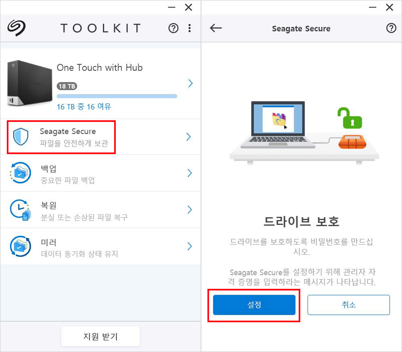 툴킷을 설치한 다음 기본 화면을 보면 네 가지 항목이 나타나는데 이 중 ‘Seagate Secure’(이하 씨게이트 시큐어)가 드라이브 암호화를 위한 기능이다. 씨게이트 시큐어 항목을 클릭하면 ‘드라이브 보호’ 화면이 나오는데 ‘설정’을 선택하면 본격적으로 암호화 설정 단계에 돌입한다.