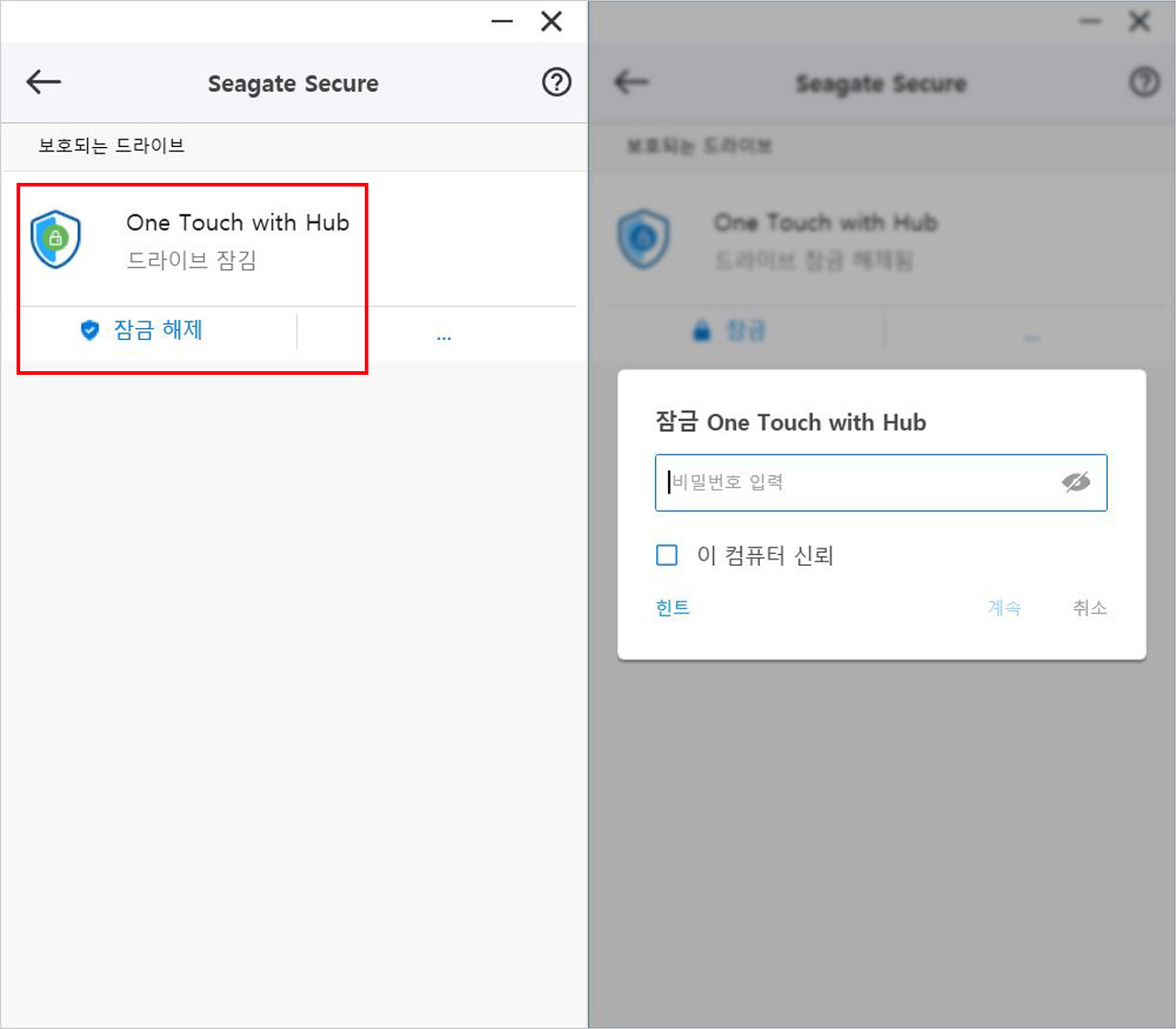 씨게이트 시큐어로 암호화시킨 원 터치 허브를 PC에 연결하면 툴킷에서 ‘드라이브 잠김’ 상태로 표시된다. 윈도우 탐색기에서는 아예 드라이브가 인식되지 않는데 툴킷에서 ‘잠금 해제’를 해야 비로소 정상 인식된다.