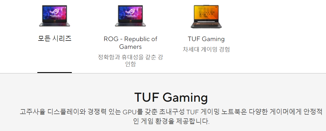 에이수스 게이밍 노트북은 ROG(Republic of Gamers), TUF Gaming(이하 터프 게이밍)두 가지로 나뉜다. ROG는 ‘정확함과 휴대성을 갖춘 강인함’이 특징인 하이엔드 브랜드다. 터프 게이밍는 ‘차세대 게이밍 경험’에 최적화된 메인스트림 브랜드라 볼 수 있다.