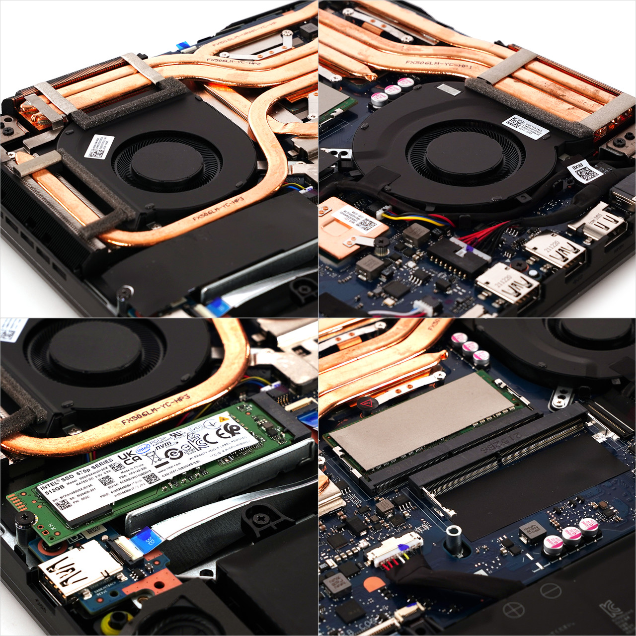 확장성은 어떨까? FX506HM은 업그레이드가 쉬운 편이다. 드라이버로 나사를 탈거 후 플라스틱 카드 한 개 정도만 준비하면 순식간에 분해할 수 있다. 노트북 내부에는 램슬롯 두 개, M.2 NVMe 슬롯 두 개를 확인할 수 있다. 참고로 램슬롯에는 후술하겠지만 필히 두 개를 채워 듀얼 채널로 사용하는 것을 권장한다.