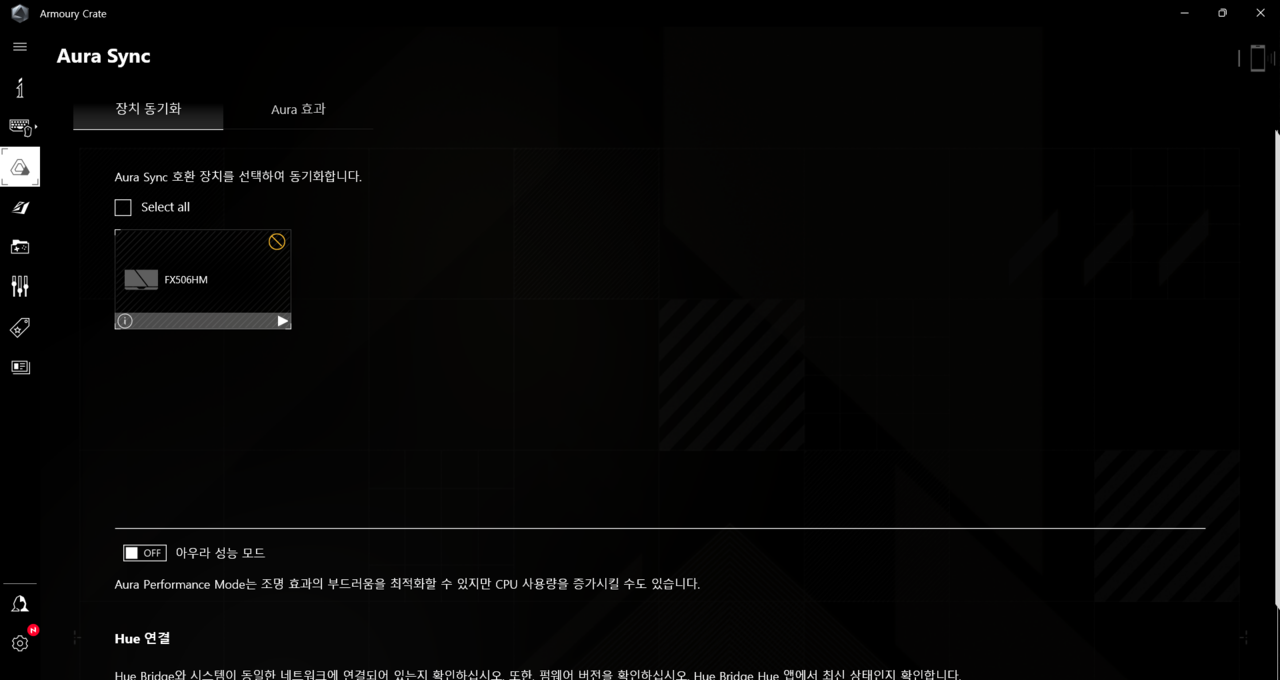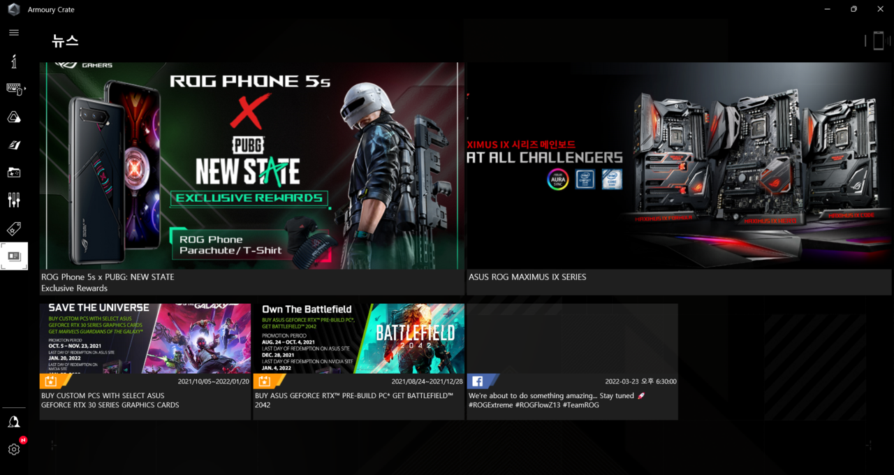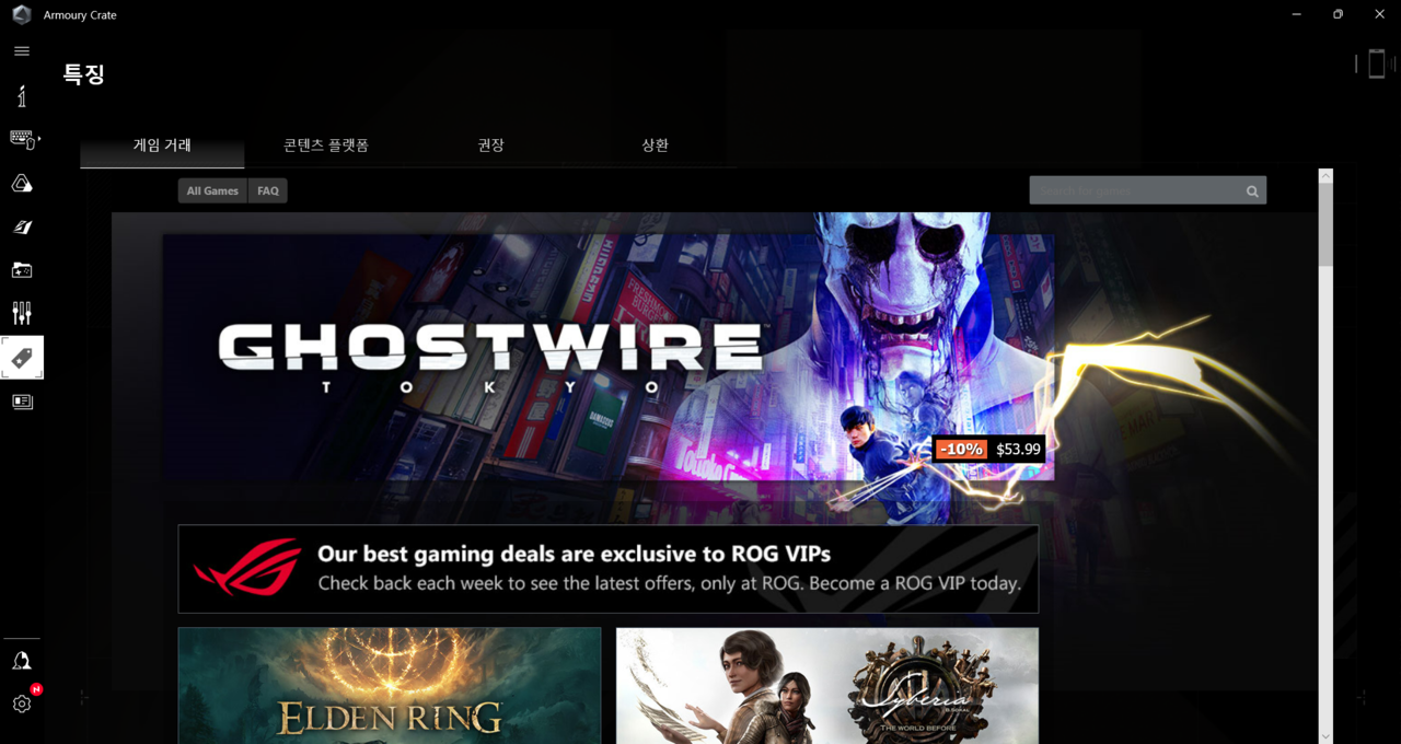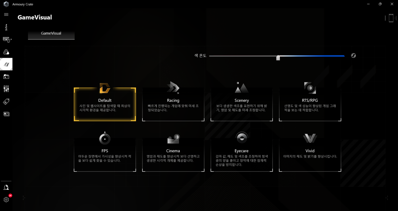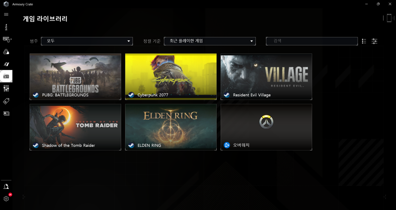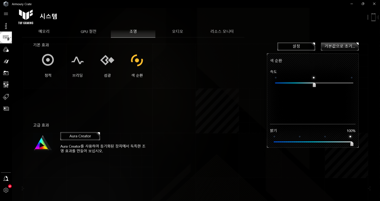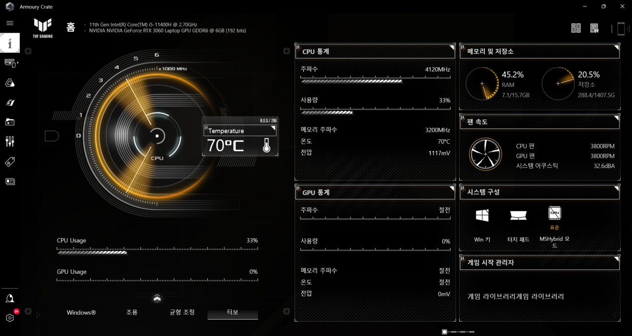 Armoury Crate는 시스템 및 조명 제어 유틸리티다. 게임 시 최대 성능(터보 모드)으로 변경할 때 자주 쓰인다.
