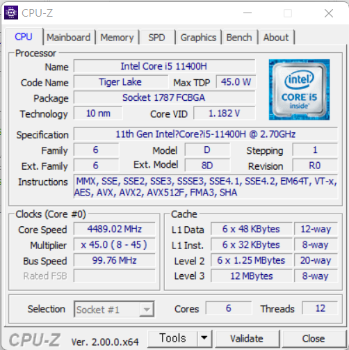 인텔 코어 i5-11400H는 11세대 타이거레이크-H 제품군이다. 6코어 12스레드, 터보 부스트 4.5GHz, 인텔 스마트 캐시 12MB를 갖췄다. 6코어 제품군이라 저전력 프로세서보다는 더 나은 성능을 기대할 수 있다. 구체적으로는 타이거레이크 H35 시리즈의 4코어 8스레드보다는 코어와 스레드 수가 더 많아 게임 시 더 낫다.