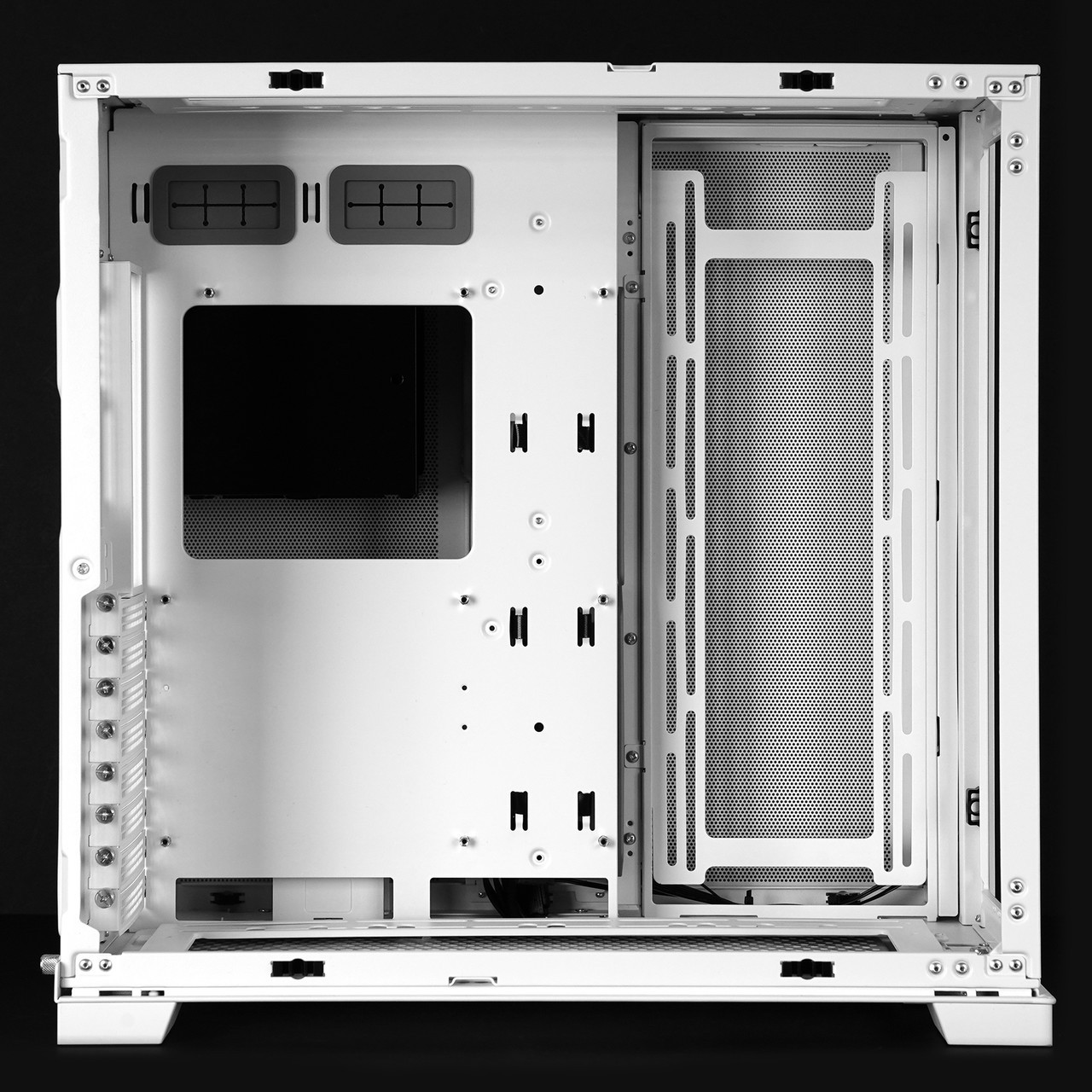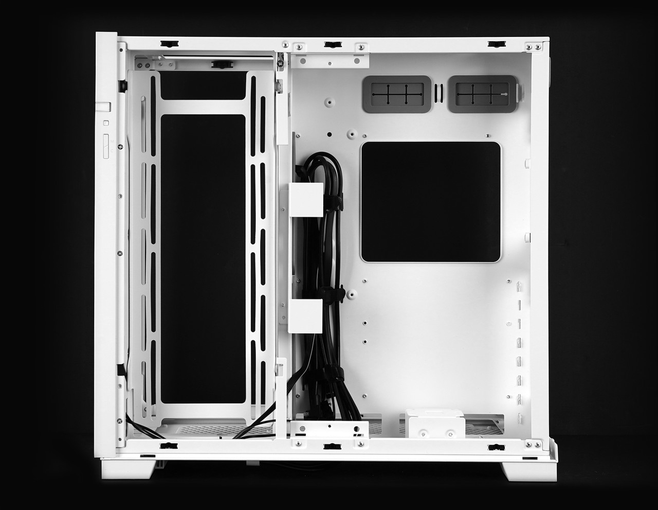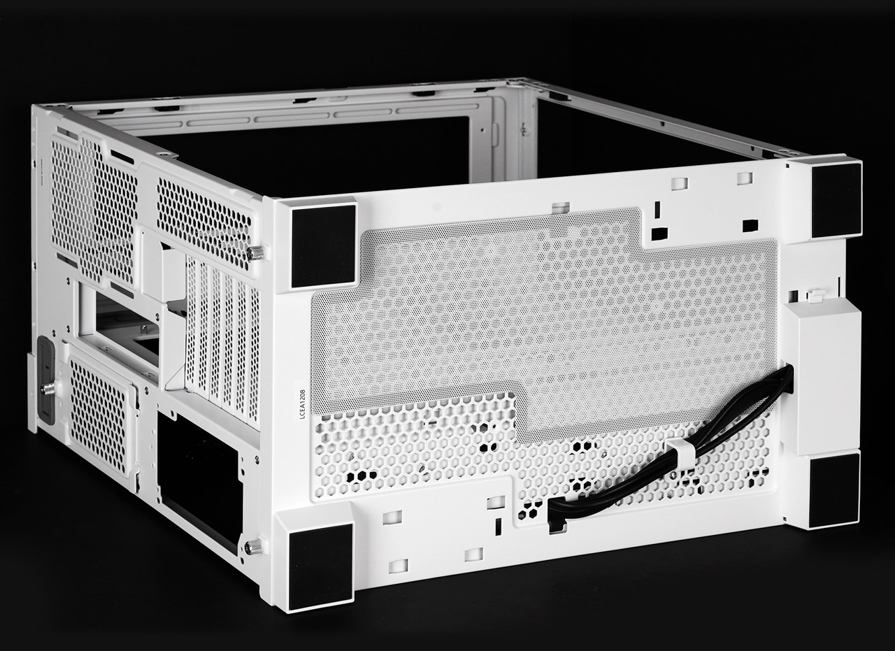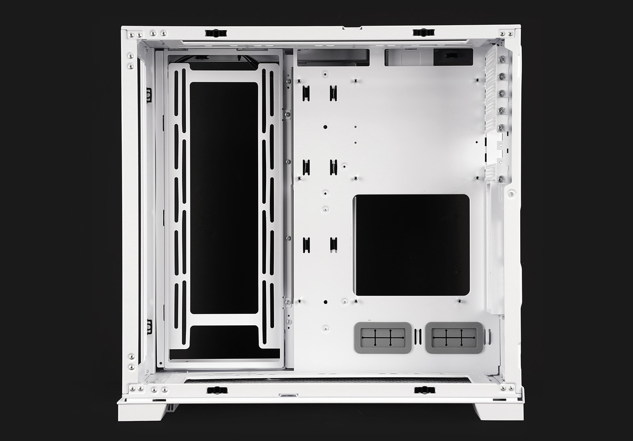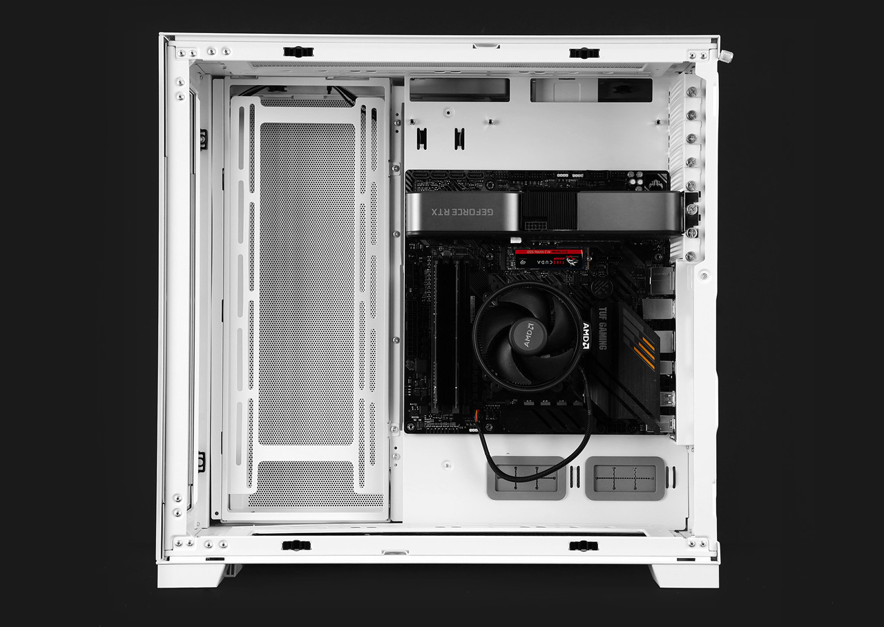 측면 강화유리 패널을 분리하면 메인보드와 그래픽카드 등 주요 하드웨어를 장착하는 공간이 보인다. 메인보드는 미니 ITX부터 E-ATX(너비 280mm 이하)까지 호환되고 그래픽카드는 최대 길이 422mm까지 장착 가능하다. 타워형 CPU 공랭 쿨러는 최대 높이 167mm인 제품까지 장착할 수 있다.