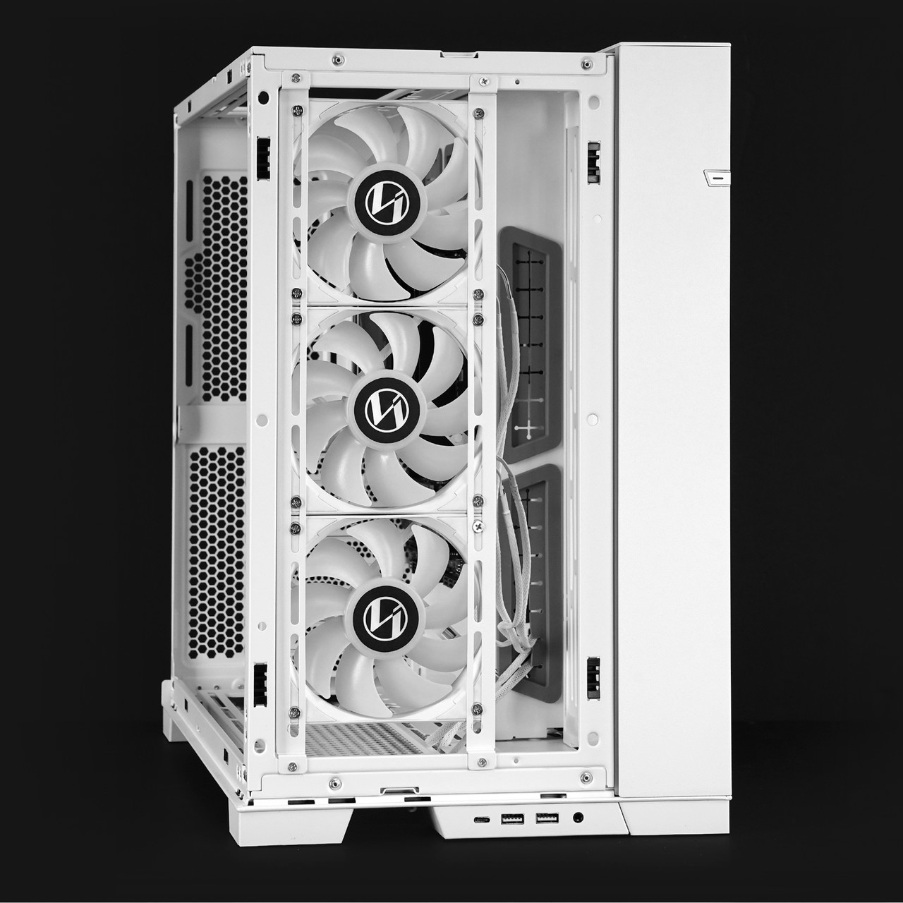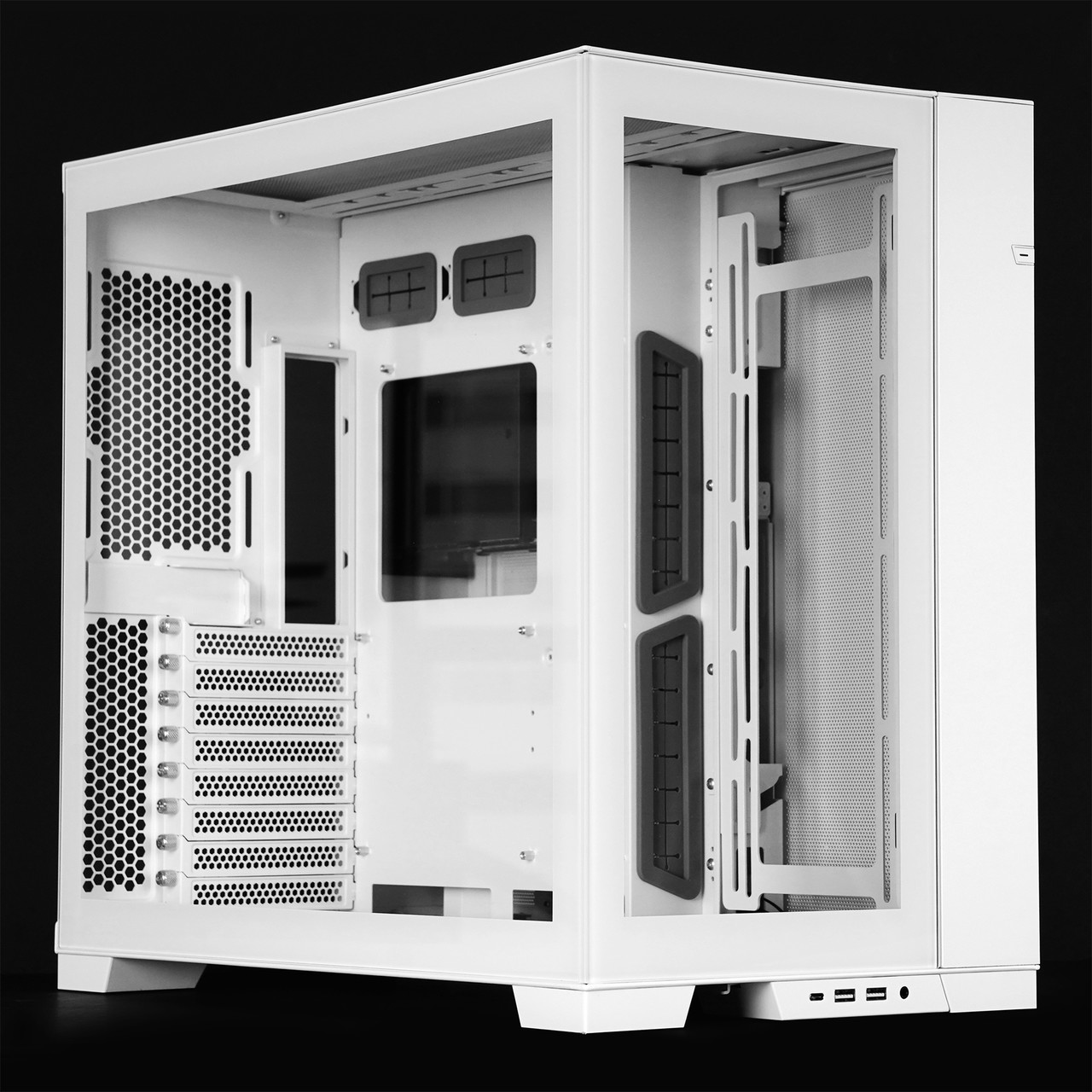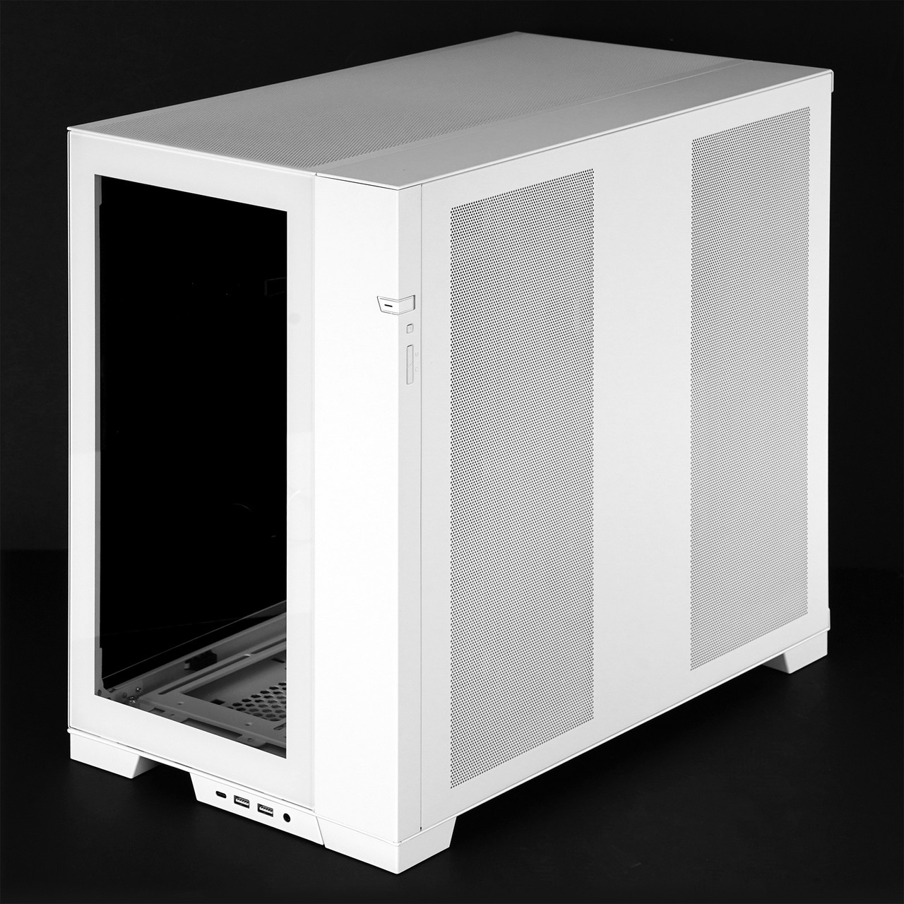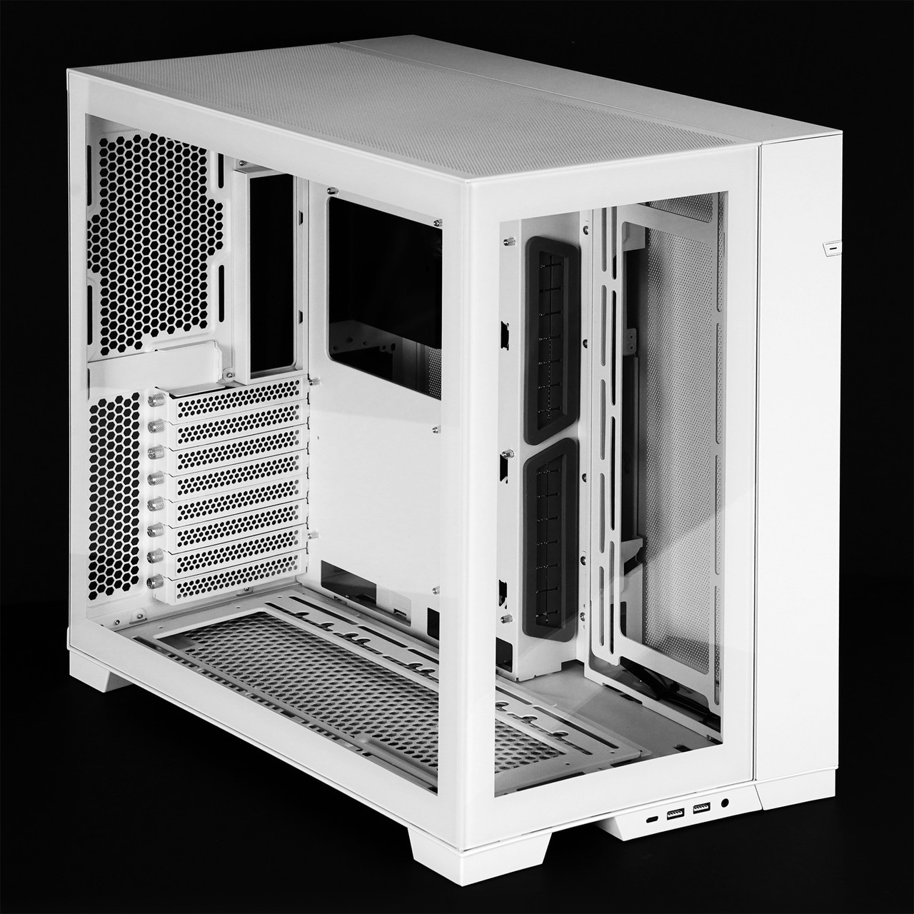 측면 강화유리 패널을 분리하면 메인보드와 그래픽카드 등 주요 하드웨어를 장착하는 공간이 보인다. 메인보드는 미니 ITX부터 E-ATX(너비 280mm 이하)까지 호환되고 그래픽카드는 최대 길이 422mm까지 장착 가능하다. 타워형 CPU 공랭 쿨러는 최대 높이 167mm인 제품까지 장착할 수 있다.
