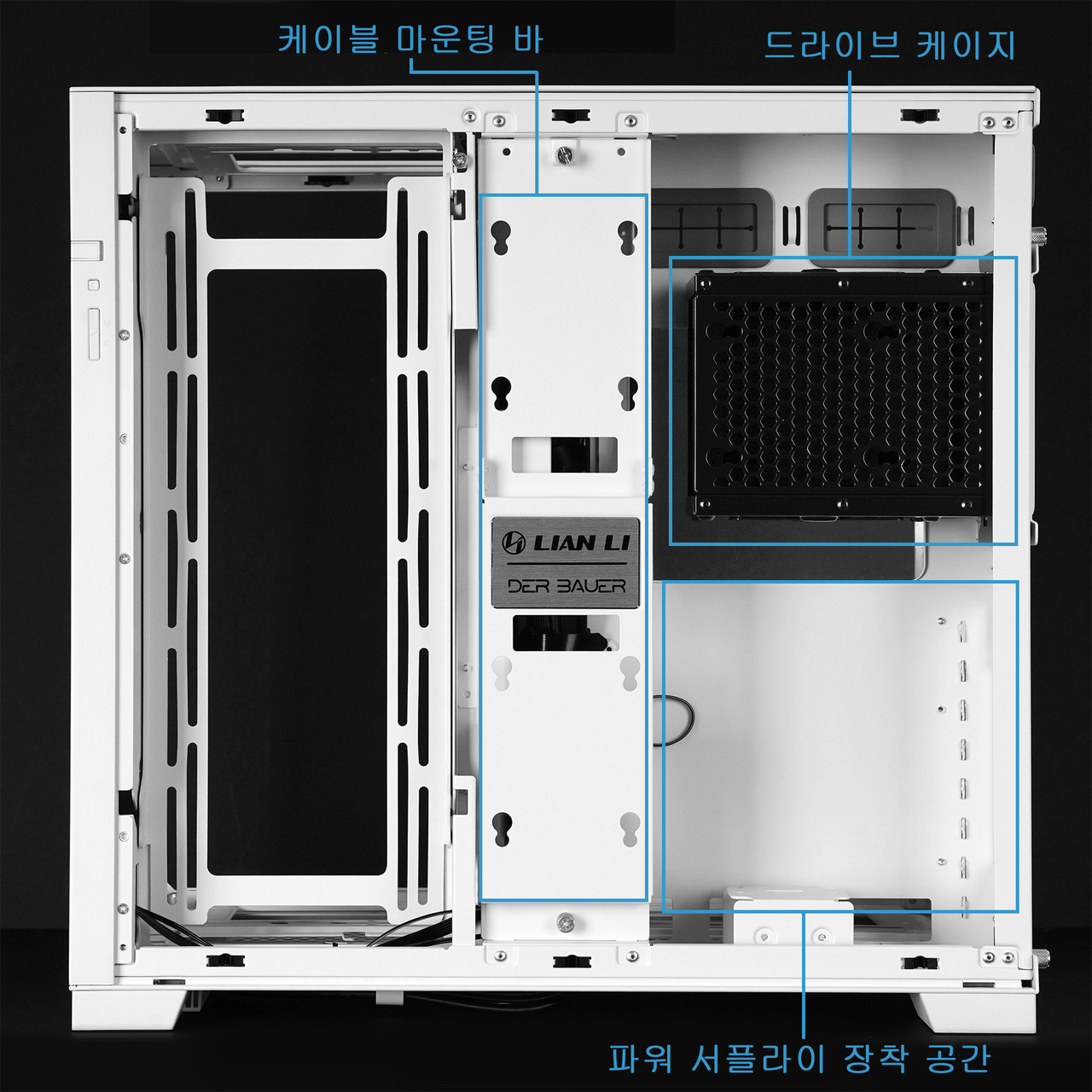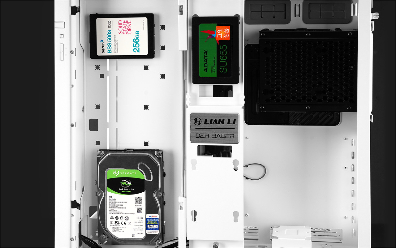 측면 강화유리 패널 반대편에는 위 사진에 표시한 것처럼 2.5인치 SSD를 장착 가능한 케이블 마운팅 바와 2.5인치 SSD 및 3.5인치 HDD를 장착할 수 있는 드라이브 케이지, 파워 서플라이 장착 공간이 있다. 케이블 마운팅 바에는 2.5인치 SSD를 2개 장착 가능하고 드라이브 케이지에는 2.5인치 SSD 3개, 3.5인치 HDD 2개를 장착할 수 있다.