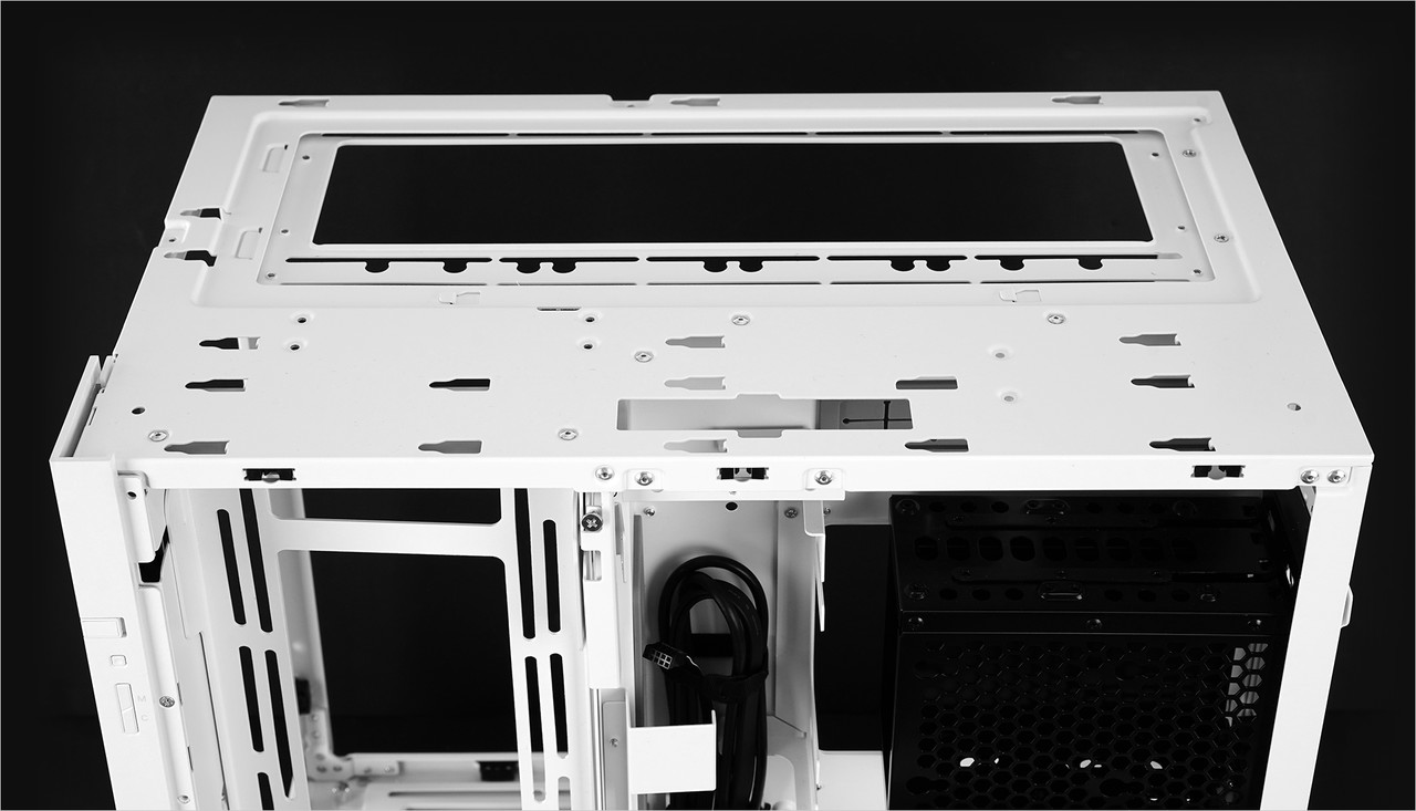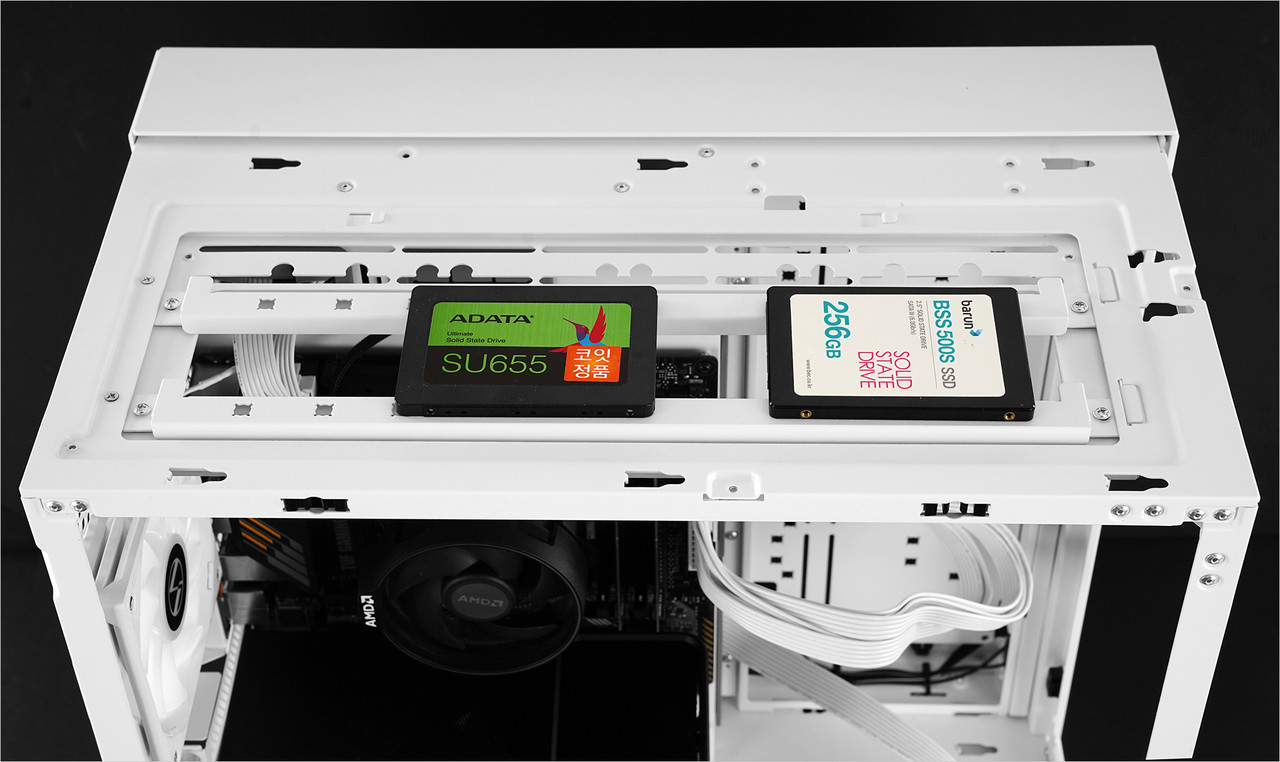 기본 구성품 중 하나인 HDD 브래킷을 이용하면 케이스 상단에도 HDD · SSD를 장착 가능하다. 2.5인치 SSD는 3개, 3.5인치 HDD는 2개 장착할 수 있다.