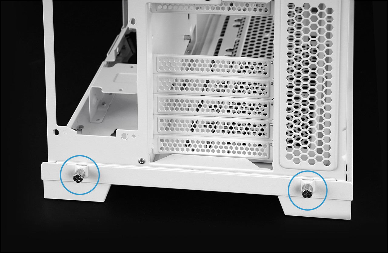 그 다음에는 케이스 후면 하단에 보이는 핸드 스크류 2개를 분리하고 하단 팬 트레이를 분리한다. 위쪽 섀시 고정이 풀려서 앞뒤로 움직일 수 있는데 아직 더 분리해야 하는 부분이 있으므로 움직이지 않도록 주의한다.