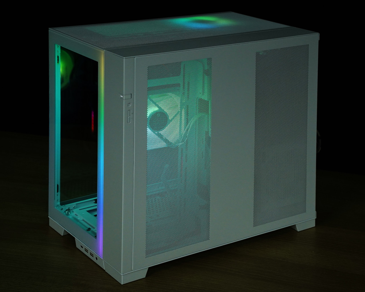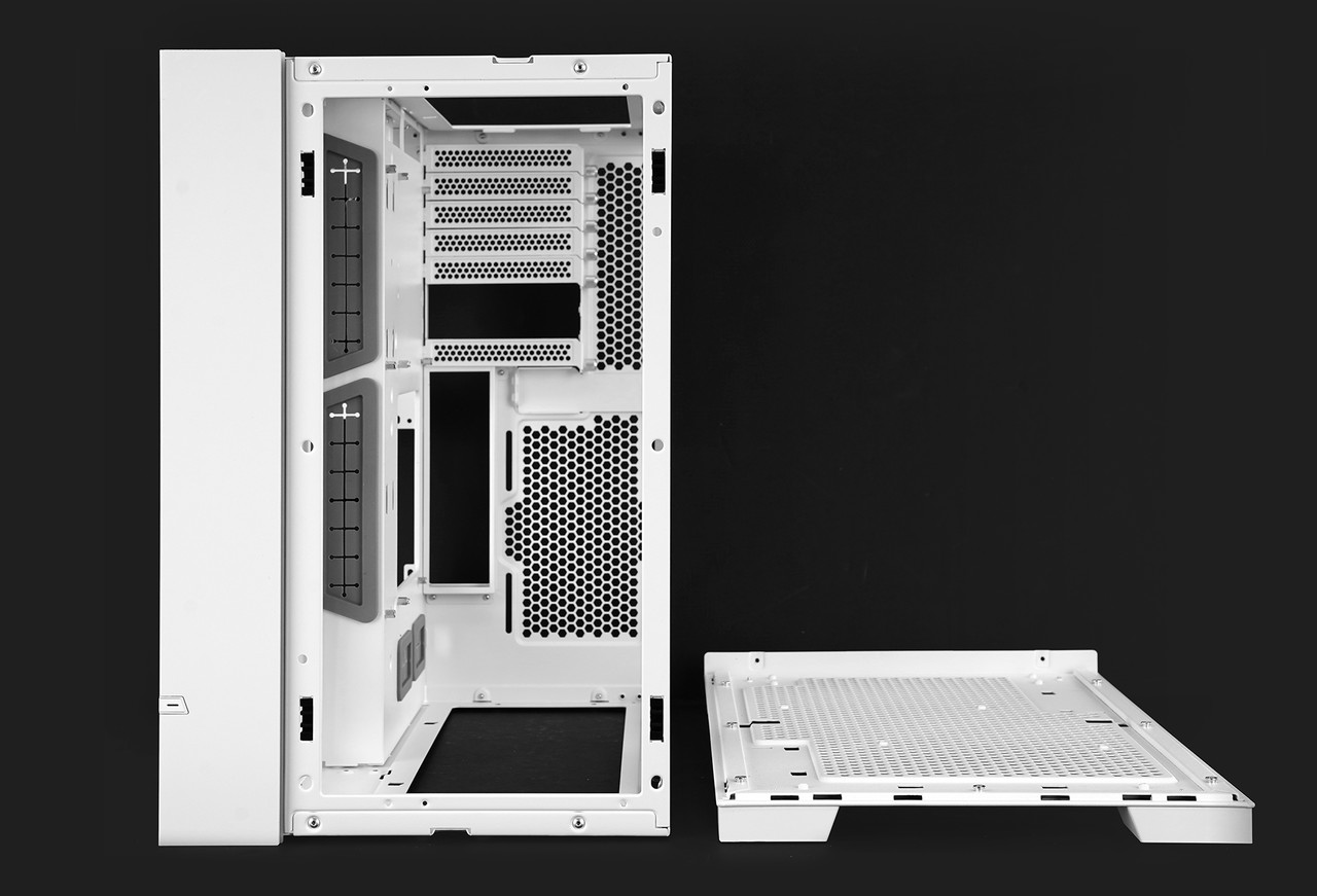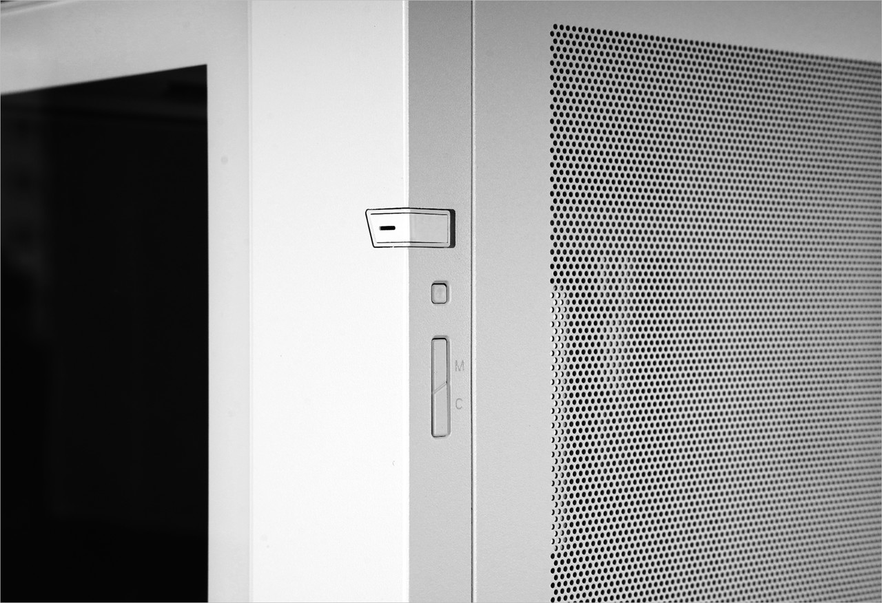 케이스 전면과 측면 한쪽은 강화유리 패널이어서 내부가 훤히 보인다. 원활한 통풍을 위해 금속 재질 측면 패널에는 넓은 면적에 촘촘한 형태로 통풍구가 있다.