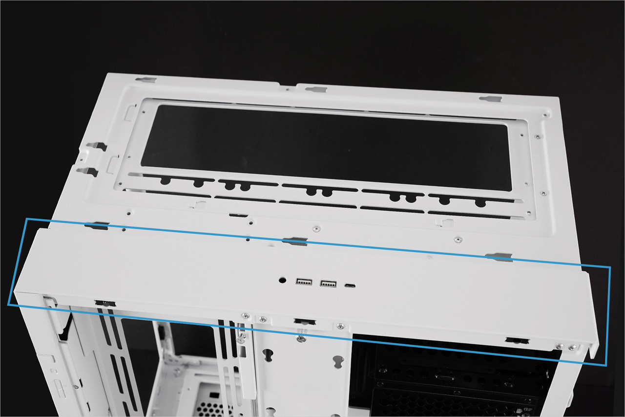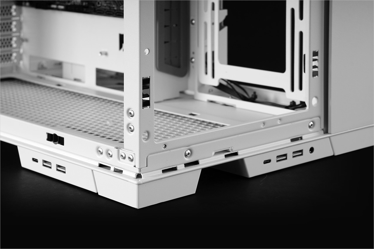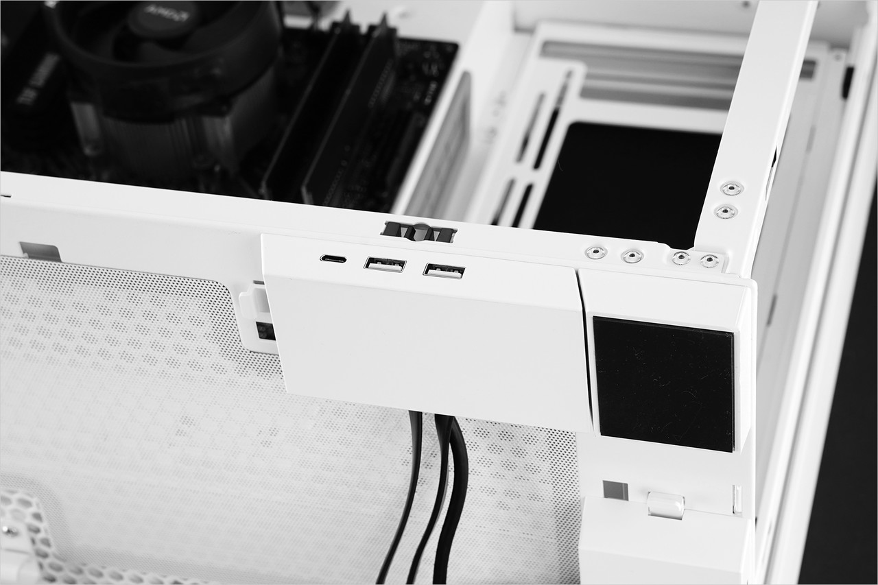 IO 키트 하우징을 분해한 다음 내부에 있는 인터페이스 커넥터를 톱 IO 키트에 나사로 장착한 다음 케이스 상단 패널을 분리해서 대체하면 된다. 이렇게 위치가 바뀌면 케이스가 책상 아래에 있는 경우에도 USB 포트와 오디오 포트를 쉽게 이용할 수 있다.