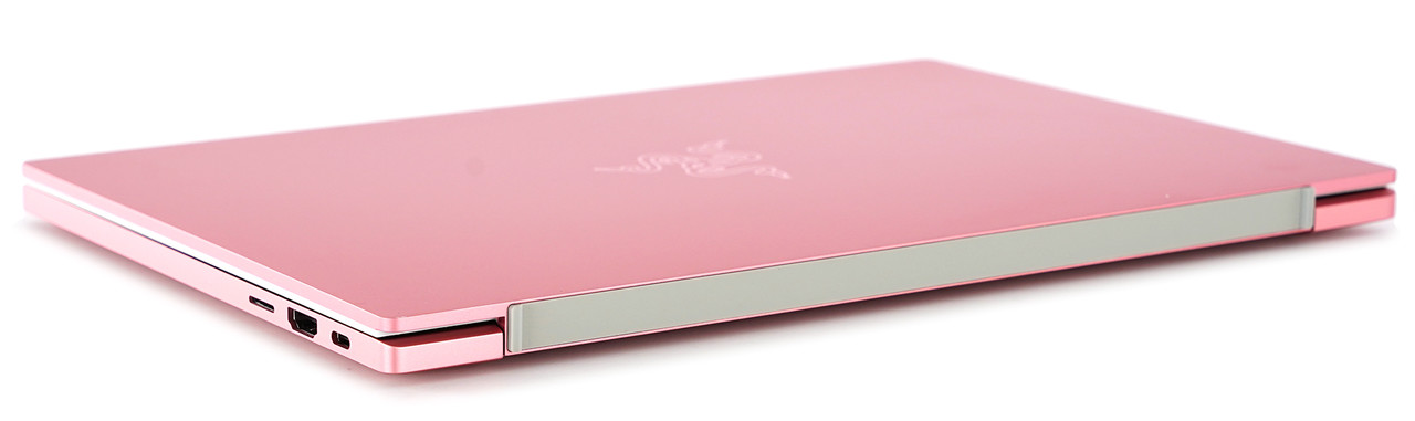 색 외의 디자인은 기존 레이저 블레이드 시리즈와 비슷하다. 상판에는 지문이 잘 안 묻는다. 레이저 로고는 빛의 방향에 따라 반짝거리며 빛난다. 측면 모서리는 곡면으로 처리돼 부드럽다. 노트북이 닫힌 상태에서는 잘 열리지 않아 안정적이다. 펼 때는 노트북 정중앙 부분의 홈에 손가락을 걸어 열어야 한다. 하단에는 고무가 크게 붙어 있어 땅바닥에서 조금 들려 있다. 해당 부분으로 찬 바람을 빨아들여 열기를 식힌다.