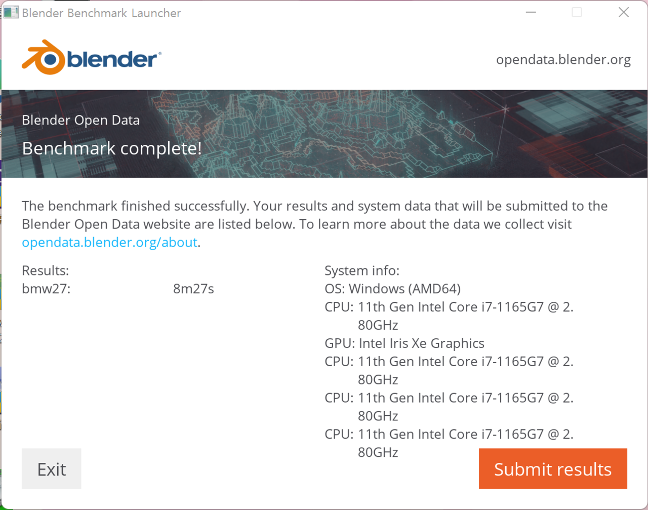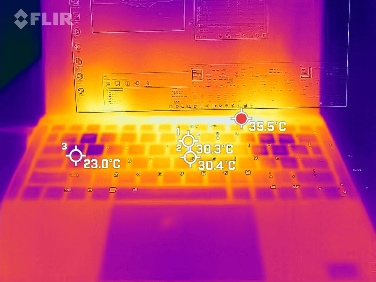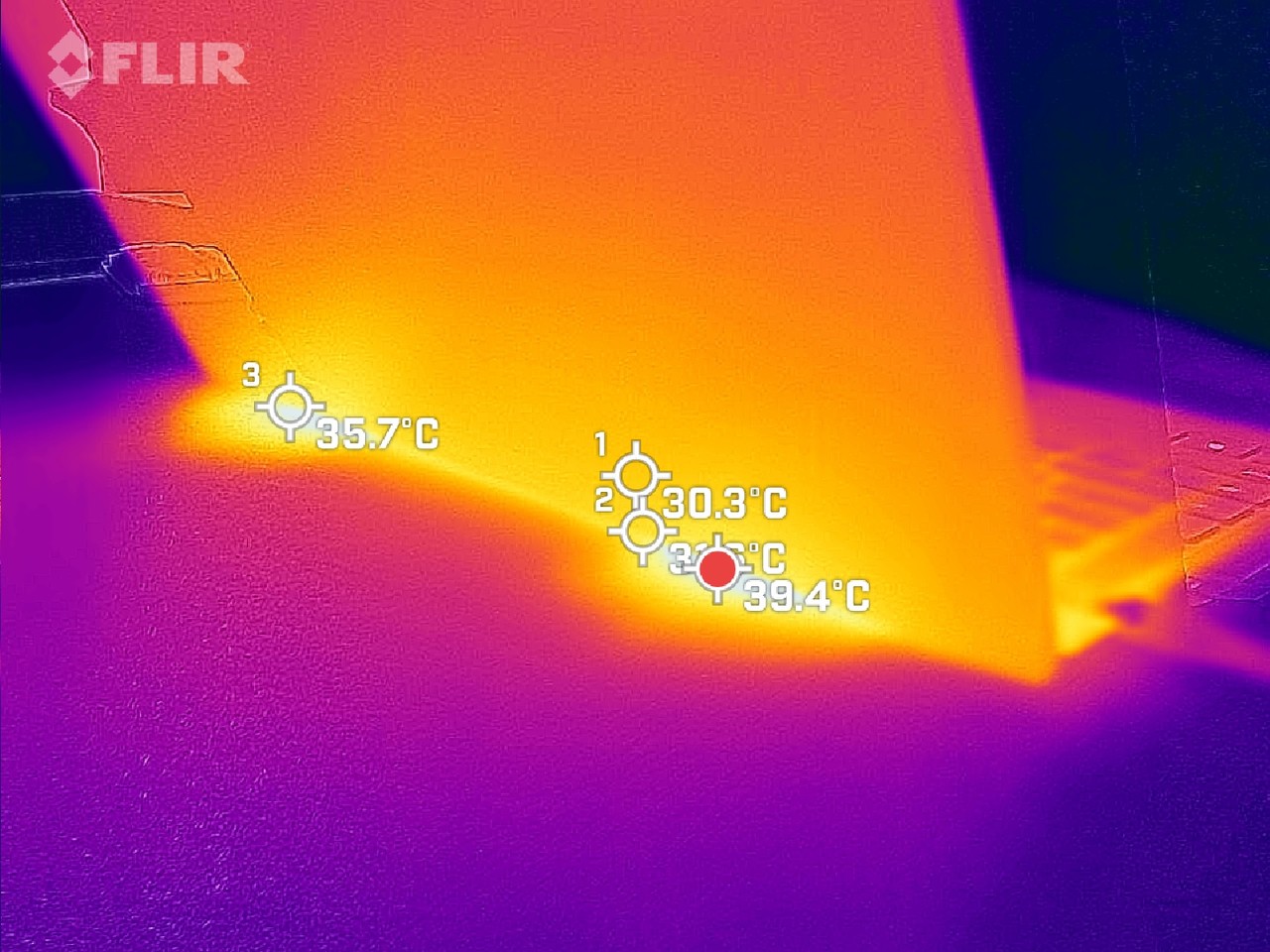 블렌더 벤치마크 도중 온도는 상판 35.5도, 후면 에어벤트 부분이 39.4도로 확인된다. 최대 온도는 100도를 찍고 70도 중반에서 80도 초반으로 확인된다. 올코어 클럭은 2.9~3.0GHz을 오간다. 블렌더 결과는 8분 27초로 측정된다.