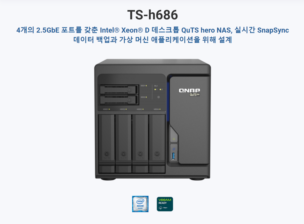 QNAP TS-h686(큐냅 TS-h686, 이하 TS-h686)은 까다로운 비즈니스 IT 환경을 위한 고성능 NAS다. 실시간 SnapSync 데이터 백업 및 가상 머신 애플리케이션을 위해 설계됐고, SR-IOV(단일루트 I/O 가상화, 물리적 네트워크 카드에서 하이퍼바이저를 우회해 가상머신에 직접 대역폭 리소스를 할당할 수 있다) 등의 가상화 기능을 지원한다. 운영체제는 ZFS 기반 QuTS hero로 데이터 무결성을 보장하며 블록 레벨의 인라인 데이터 중복 제거 및 압축, 무한대에 가까운 스냅샷, 실시간 SnapSync를 지원한다.