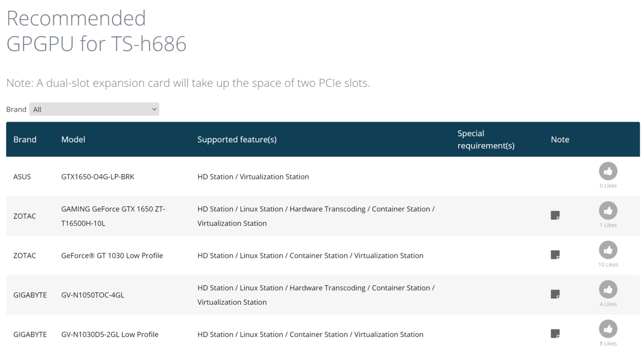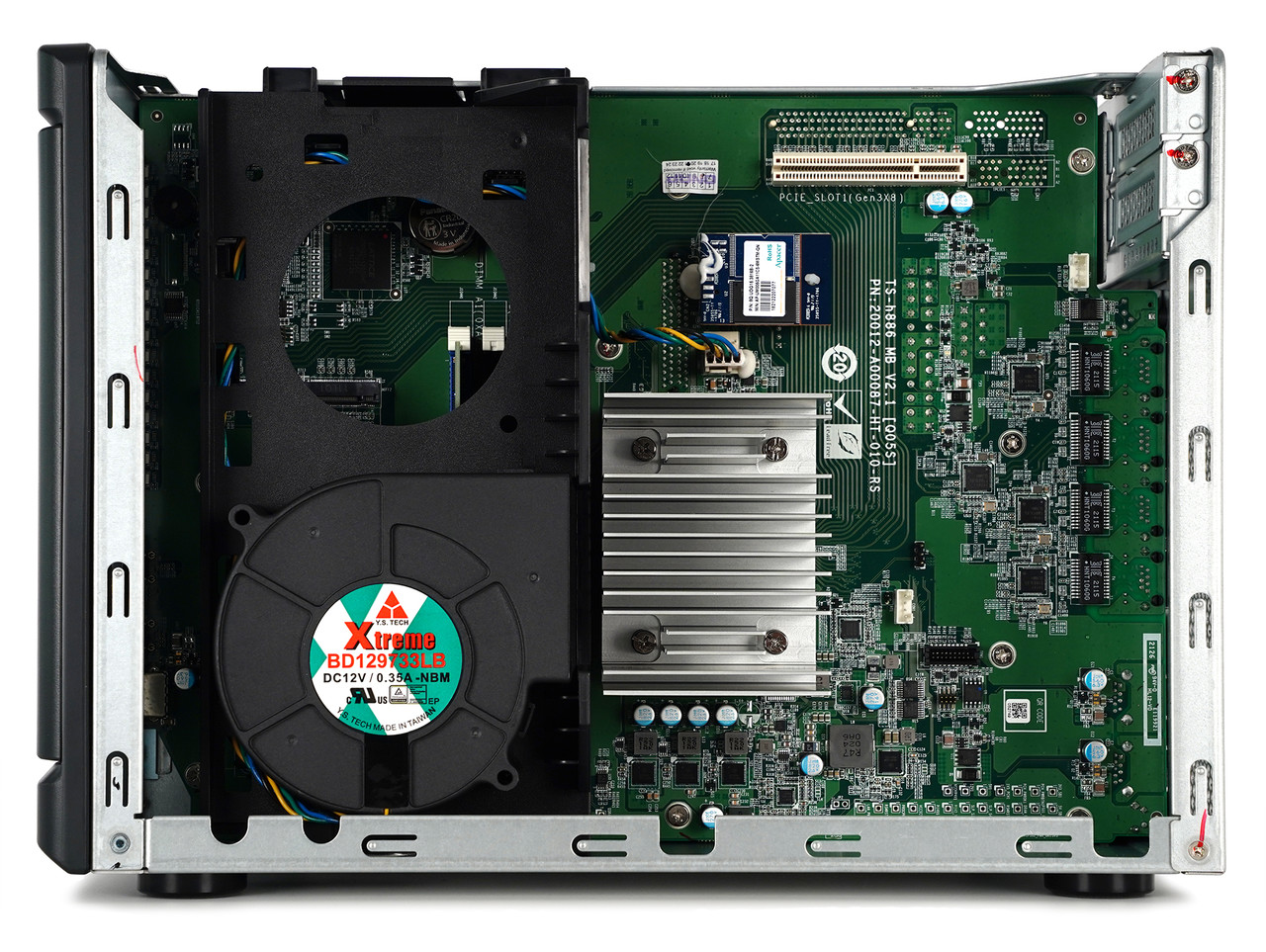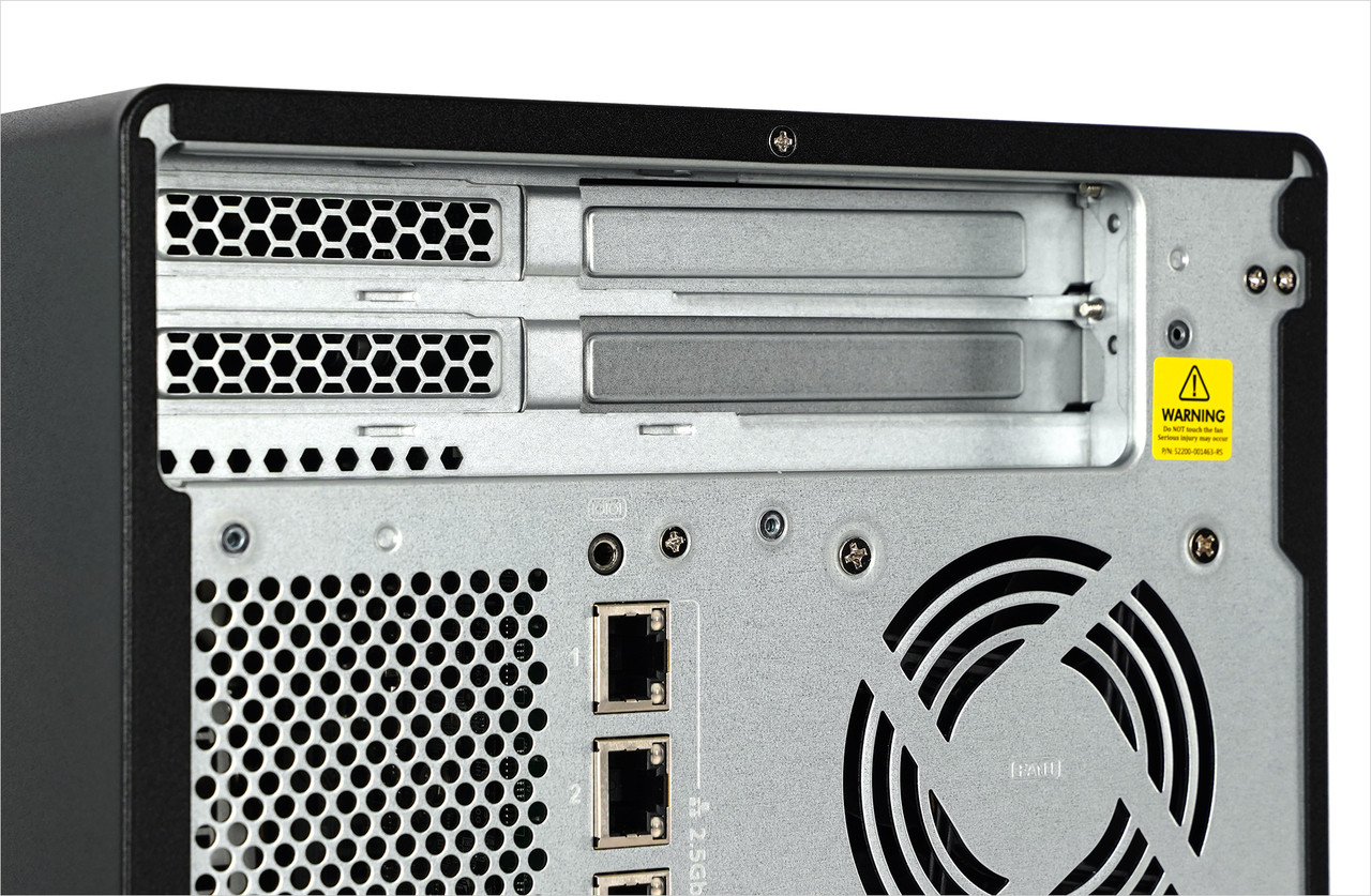 추가로 PCIe Gen3 x8 슬롯이 두 개 제공되는데, 해당 확장 슬롯을 통해 5, 10, 25, 40GbE 네트워크 확장 카드, QM2 카드, 그래픽카드 등을 장착할 수 있다. 그래픽카드에 의문을 가질 수 있는데, 그래픽카드를 장착하면 HDMI 출력이 추가돼 데스크톱처럼 활용할 수 있다. 비디오 편집 및 4K 트랜스코딩도 개선되며 가상 머신으로 GPU 패스스루도 활용할 수 있다.