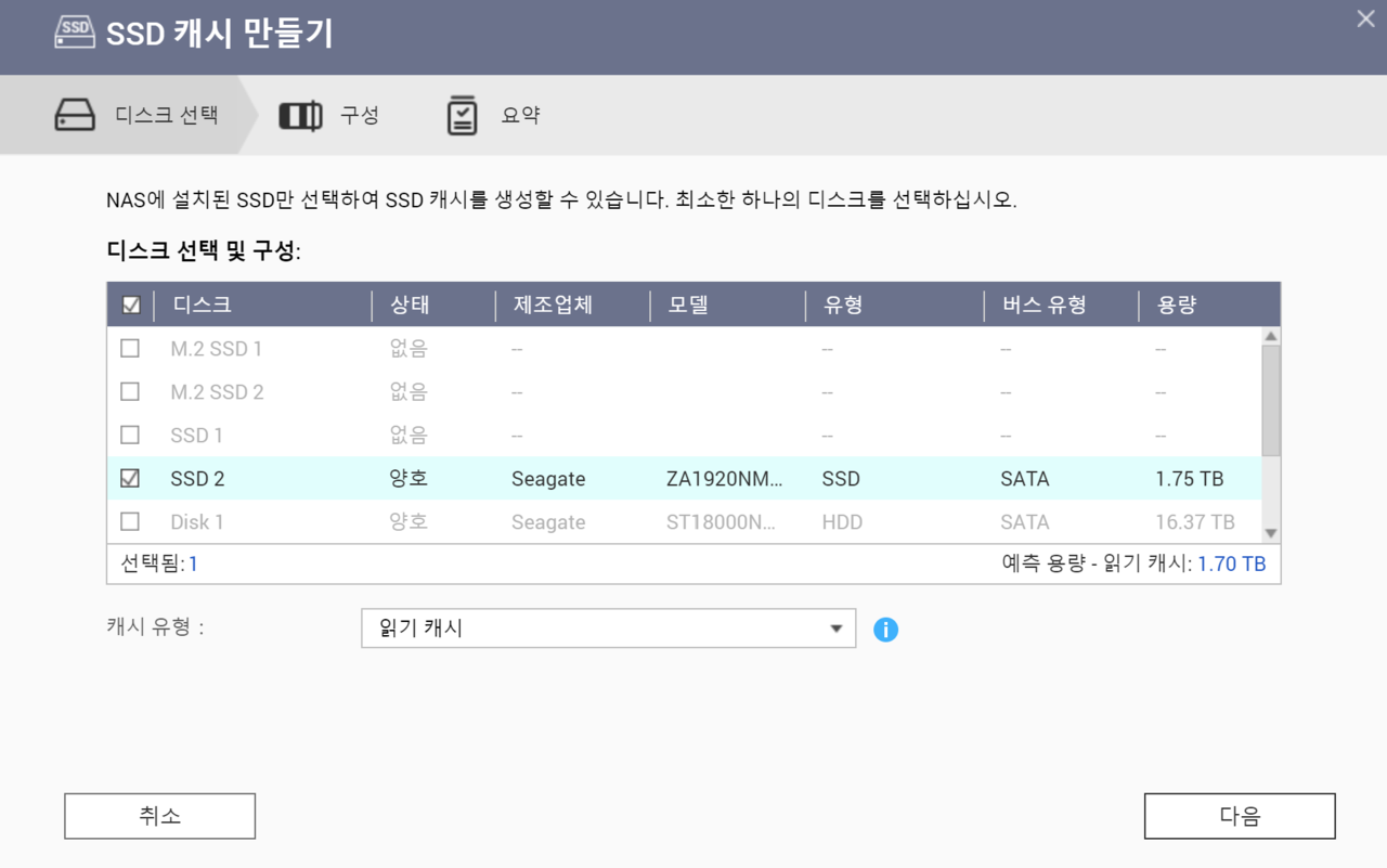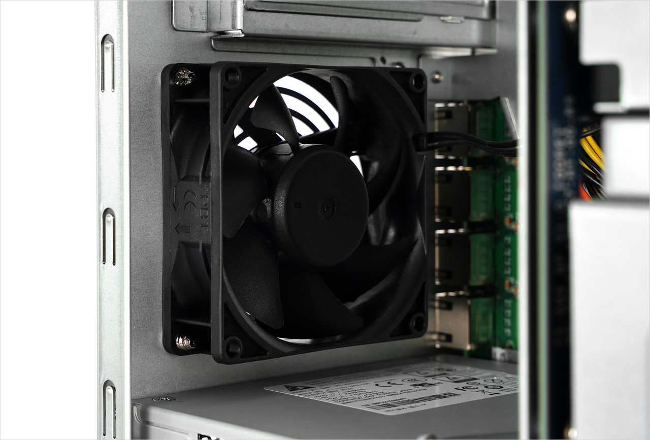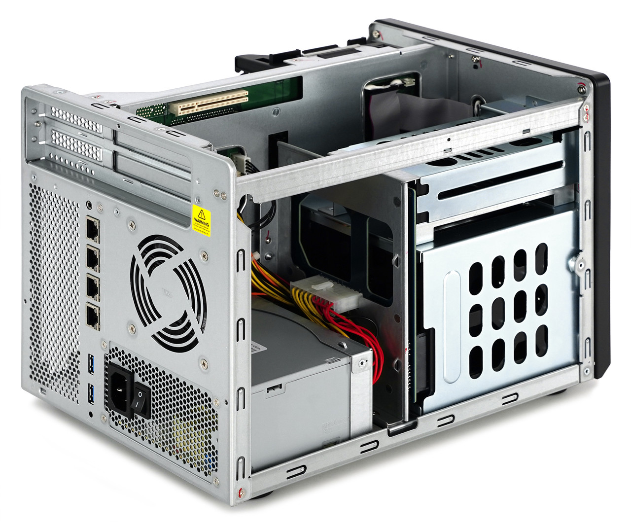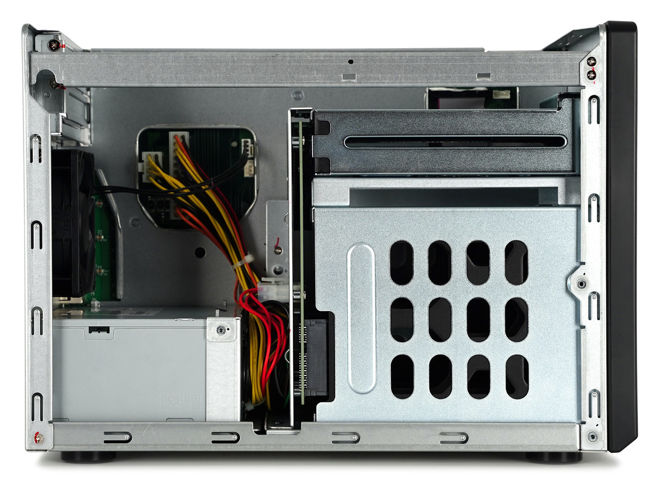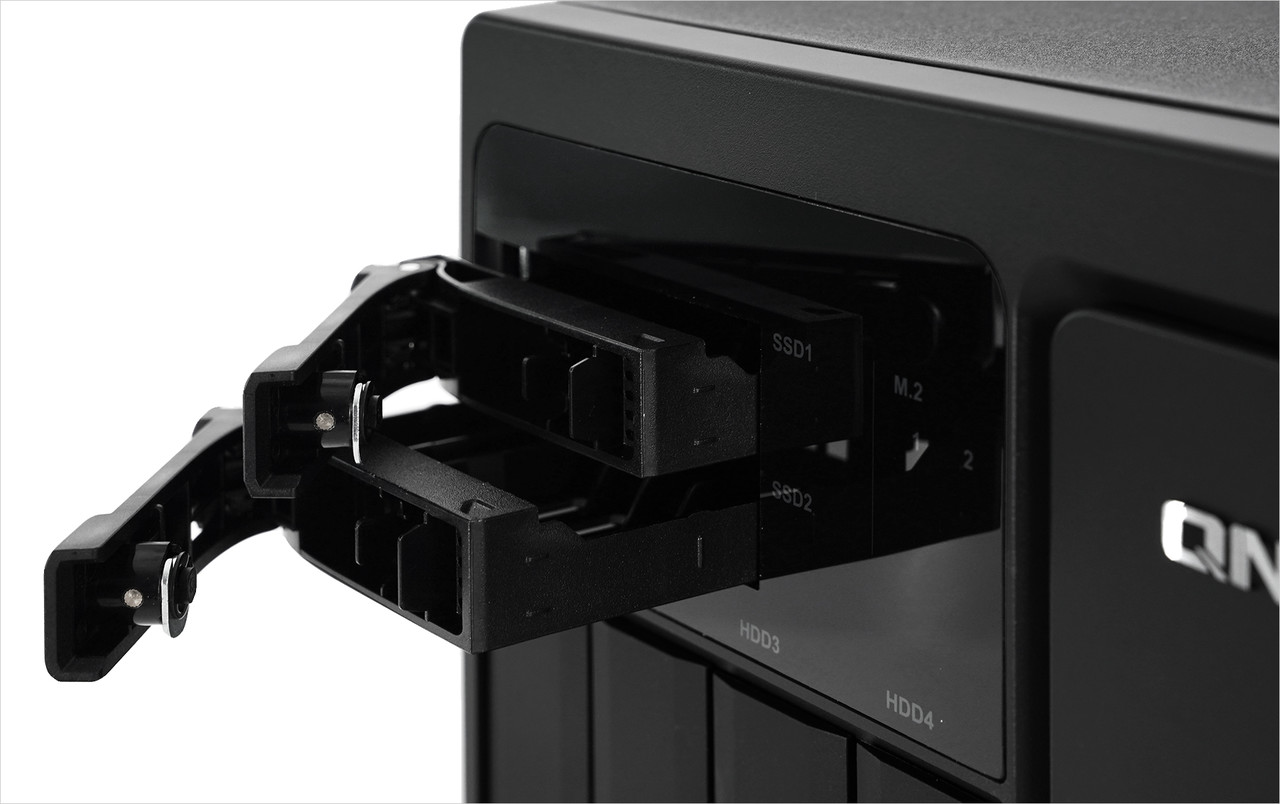 드라이브 베이는 3.5인치 SATA3 HDD만 두고 보면 4베이다. 그런데 2.5인치 SATA 스토리지를 저장할 수 있는 공간이 두 개 주어진다. 시스템 내부에는 M.2 22110/2280 PCI Gen3 슬롯 2개가 지원된다. 즉 SSD를 총 4개로 운용할 수 있다. 이 점에 주목할 만하다. 우선, NVMe M.2 SSD 두 개로 SSD 캐싱을 사용할 수 있다. 혹은 캐싱 대신 고속 드라이브로도 활용이 가능하다.