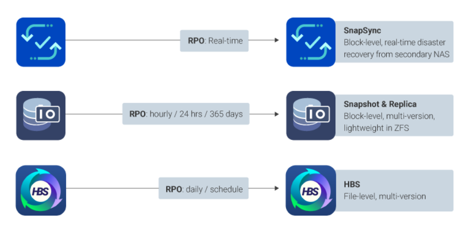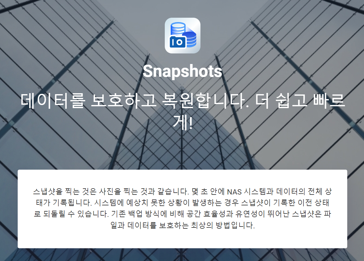 가장 중요한 건 즉각적인 스냅샷과 실시간 SnapSync 기능이 제공된다는 점이다. 최대 65,535개의 스냅샷을 지원한다. 매 시간 1개의 스냅샷이 생성되며 이는 하루 24개의 스냅샷으로 이어진다. ‘쓸 때 복사’ 기능으로 진행 중인 데이터 쓰기에 영향을 주지 않고 스냅샷을 바로 생성한다. SnapSync는 기본 NAS와 보조 NAS가 동일한 데이터를 유지할 수 있게 보장해 준다.