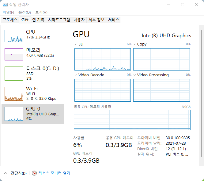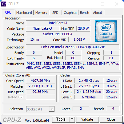 CPU : 인텔 코어 i3-1115G4(3.0~4.1GHz 6MB L3 캐시메모리)