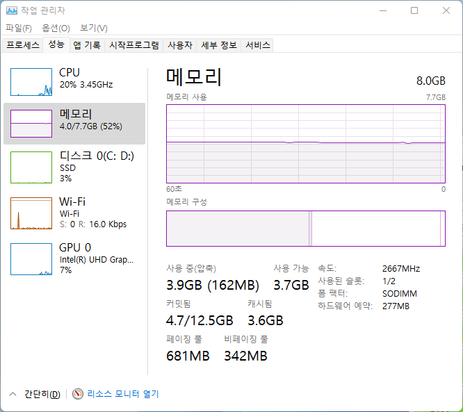 메모리 : DDR4 8GB(8GB x1, 2 SODIMM)