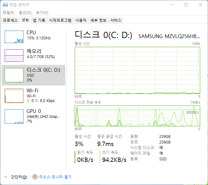 저장장치 : 256GB(M.2 NVMe), 총 HDD 슬롯 1개, 총 SSD 슬롯 1개