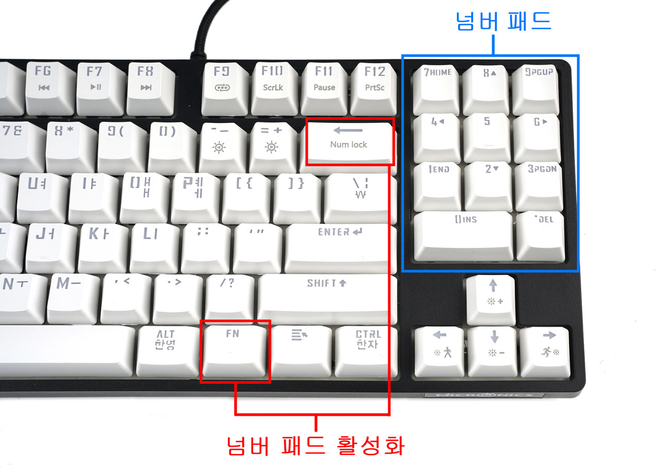 마닉 EX89 텐키리스 프로는 그 점을 보완하기 위해 화살표 키 위쪽에 배치한 키 9개를 넘버 패드로 활성화하는 기능을 제공한다. 오른쪽 알트(ALT) · 한영 키 바로 옆에 있는 FN(펑션) 키와 ‘Num lock’(넘락)이 표기된 백 스페이스 키를 동시에 누르면 오른쪽에 있는 키 10개가 넘버 패드로 전환된다.