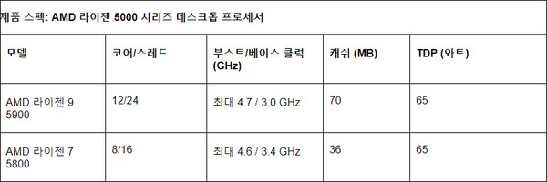 데스크톱용 프로세서는 ‘라이젠 9 5900’과 ‘라이젠 7 5800’이며 각각 ‘라이젠 9 5900X’와 ‘라이젠 7 5800X’에서 클럭을 조정해 TDP를 낮춘 것이 특징이다.