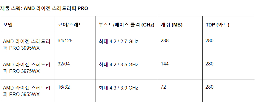 AMD 라이젠 스레드리퍼 PRO 프로세서는 워크스테이션용이다. 코어 개수 최대 64개, 메모리 채널 8개, RDIMM 및 LRDIMM 제공, 128개에 달하는 PCI-Express 4.0 레인, AMD PRO 보안 기술 등 첨단 기능이 적용된다. 올해 3월에 출시 예정이다.