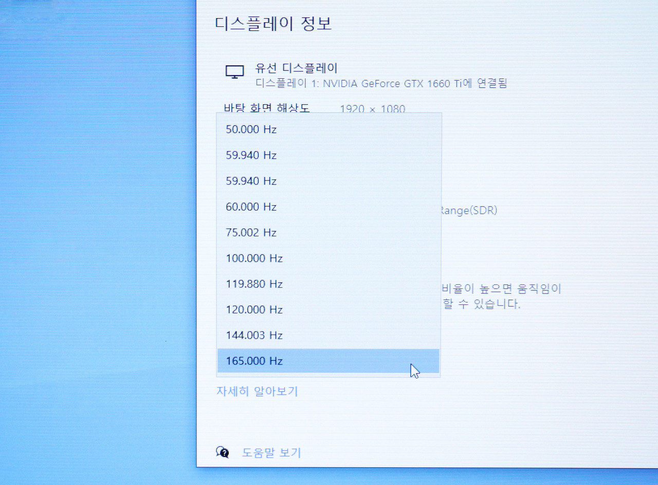 동일한 구간을 몇 차례 반복해서 보면 카이저 P27F165 카이팅은 캐릭터가 빠르게 움직이거나 시점을 돌려도 화면이 부드럽게 느껴진다. 반면에 60Hz 모니터는 화면이 자주 끊기는 느낌이 든다.